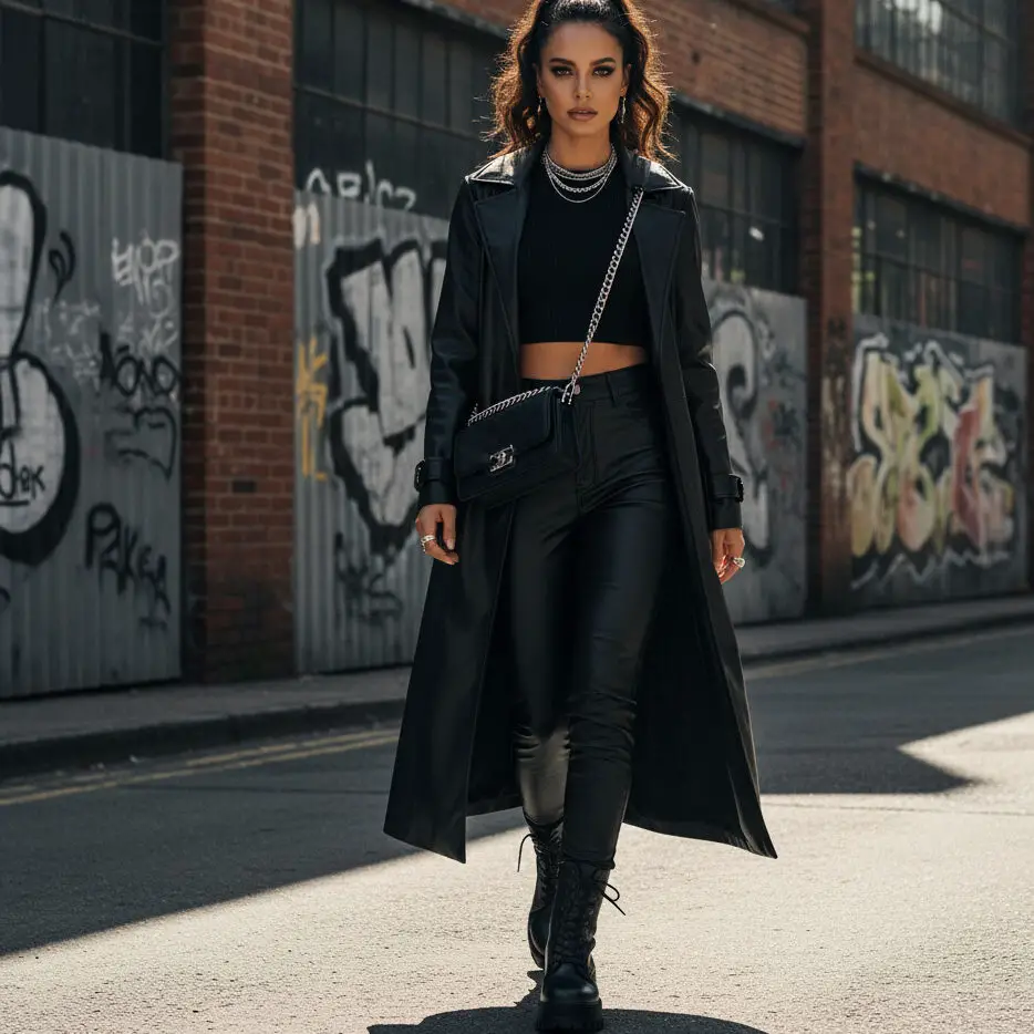 Combine a black leather trench coat with a black crop top, faux leather pants, and combat boots. Add a chain bag to amplify that dark-glam street edge.