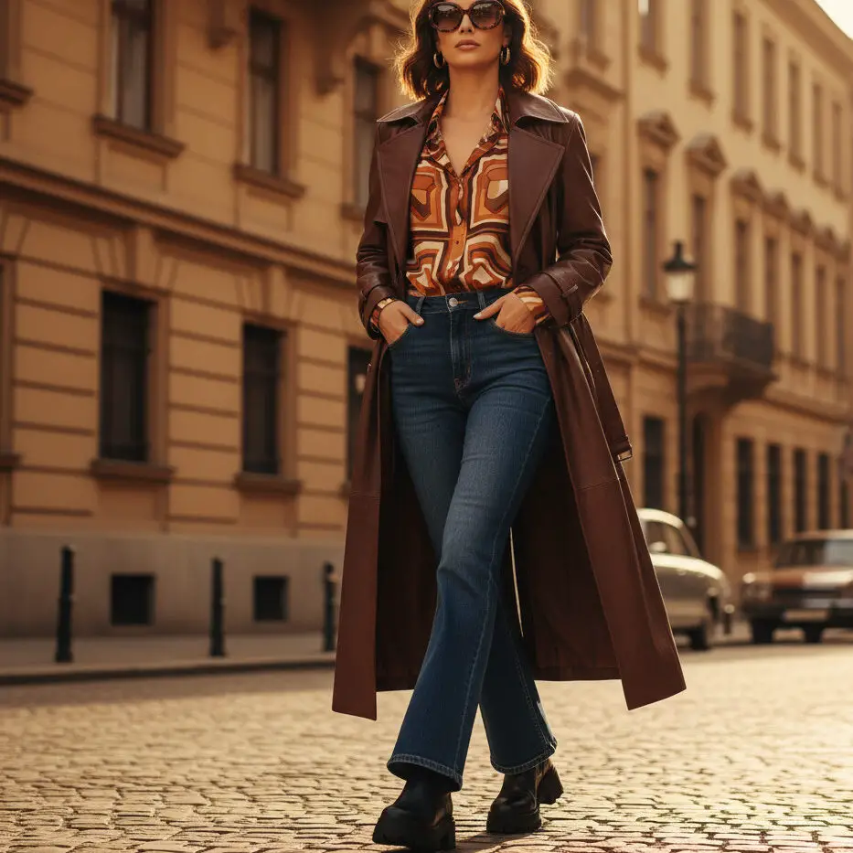 Opt for a belted long leather coat outfit with flared jeans, a printed blouse, and platform boots. Add oval sunglasses for a subtle ’70s nod.