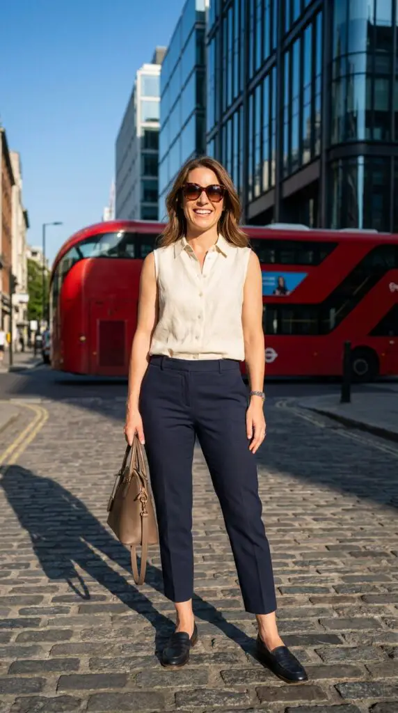 A soft blouse tucked into high-waisted wide-leg pants creates a refined city outfit. The silhouette feels elegant yet comfortable for walking around London. Add block-heel sandals and a structured bag for a stylish look that blends comfort with sophistication.
