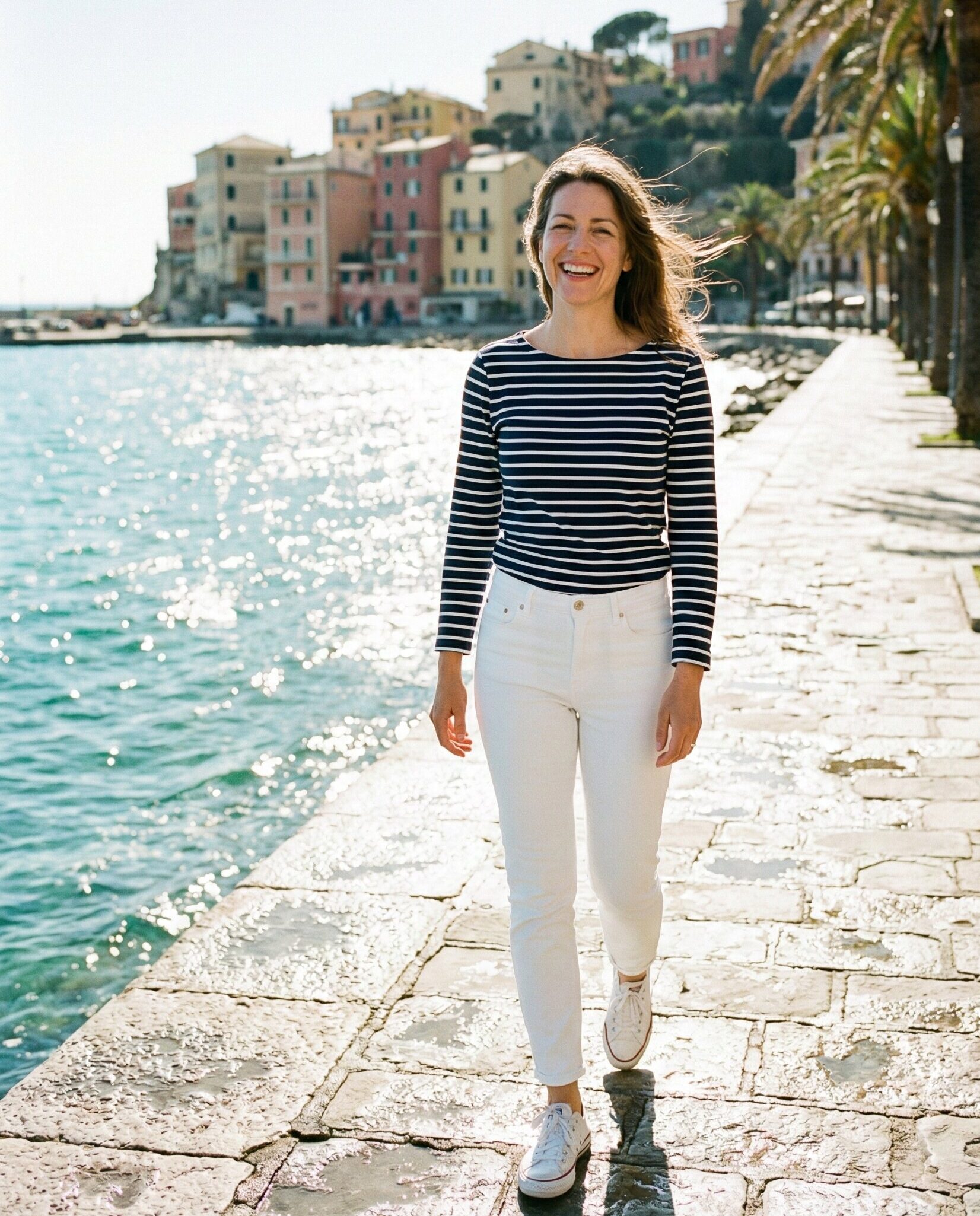 A classic striped Breton top channels effortless coastal charm. Paired with white jeans, it creates a crisp Mediterranean-inspired look. Ideal for cooler April days, this outfit works beautifully for harbor strolls or café visits. Finish with loafers or comfortable sneakers.