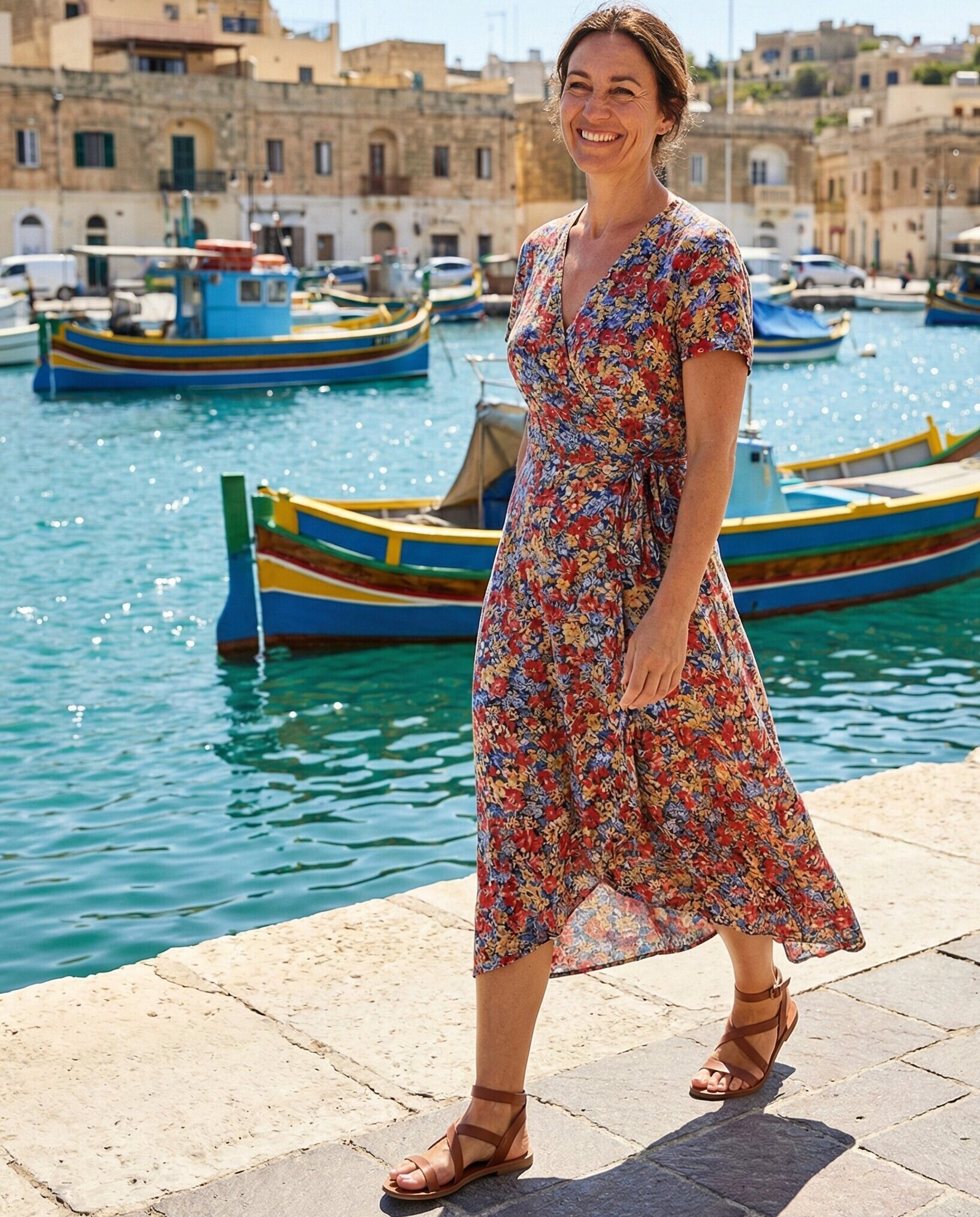 A floral wrap dress captures the romantic Mediterranean aesthetic. It flatters every body type while staying comfortable in mild temperatures. Ideal for May and June cruises, this dress works well for sightseeing and semi-formal dinners. Pair with wedges or strappy sandals for a feminine finish.