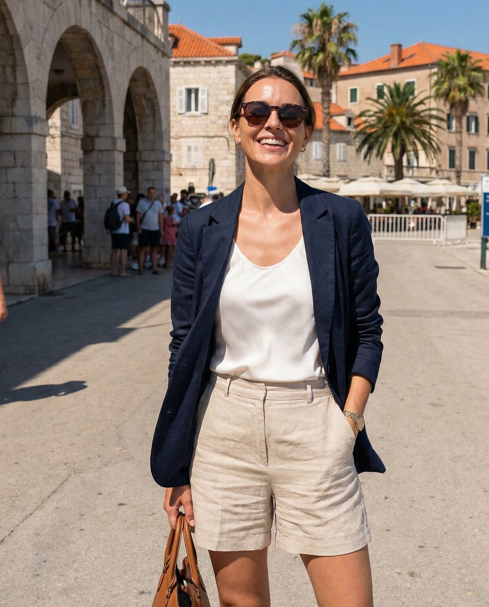 For warmer June afternoons, tailored shorts paired with a sleeveless top look chic and modern. Add a lightweight blazer for structure and evening warmth. This outfit feels polished yet relaxed, perfect for stylish port arrivals or casual onboard gatherings.