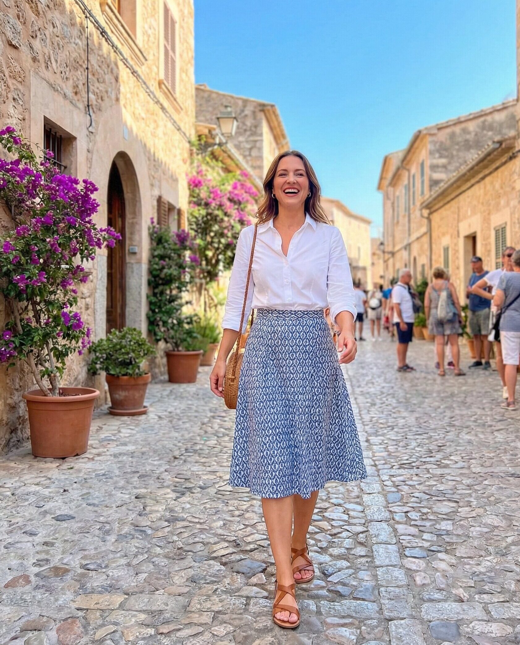 A crisp button-down shirt tucked into an A-line skirt creates a polished cruise look. This outfit works beautifully for cultural port visits or daytime city tours. Choose breathable fabrics to stay comfortable while exploring historic streets.