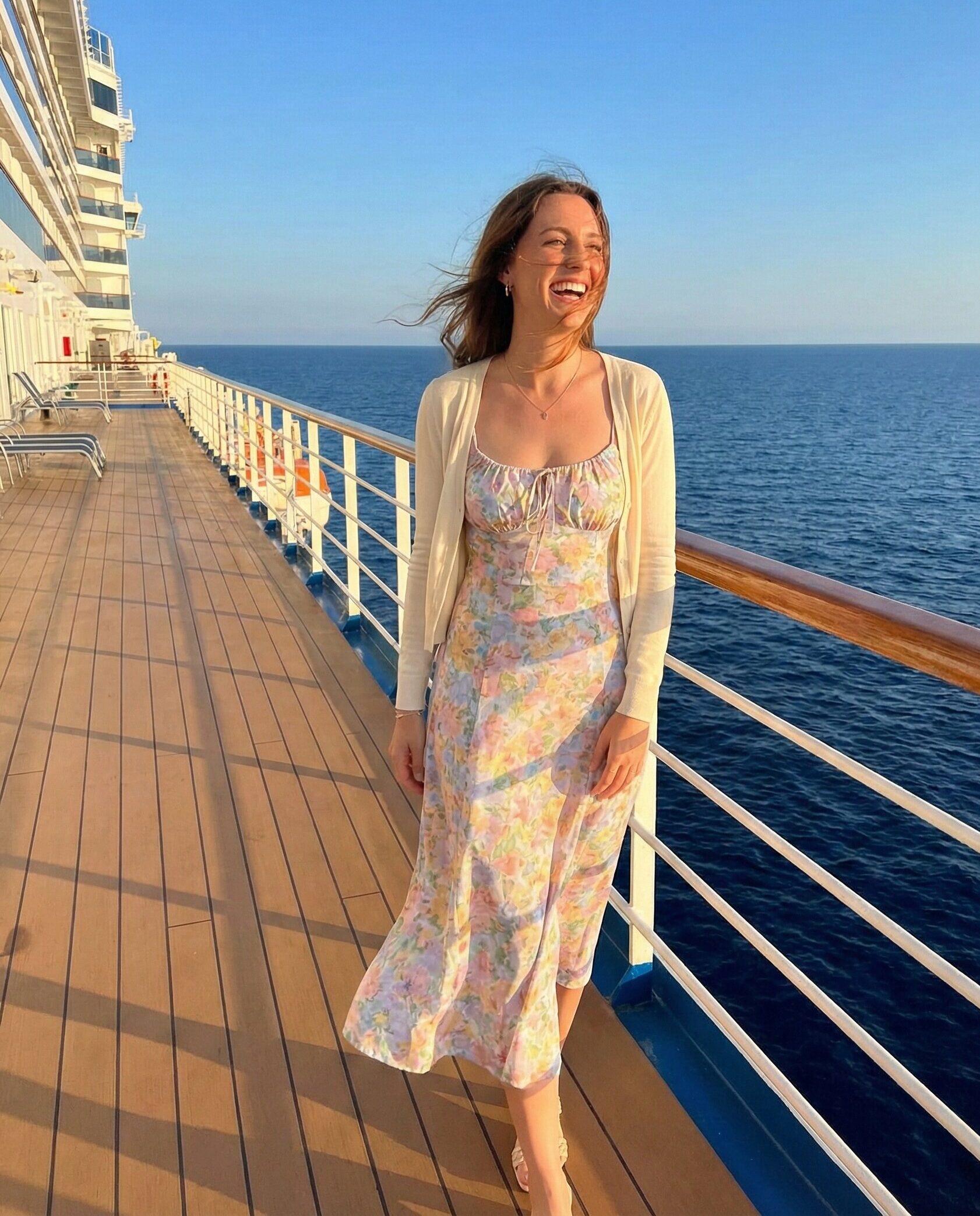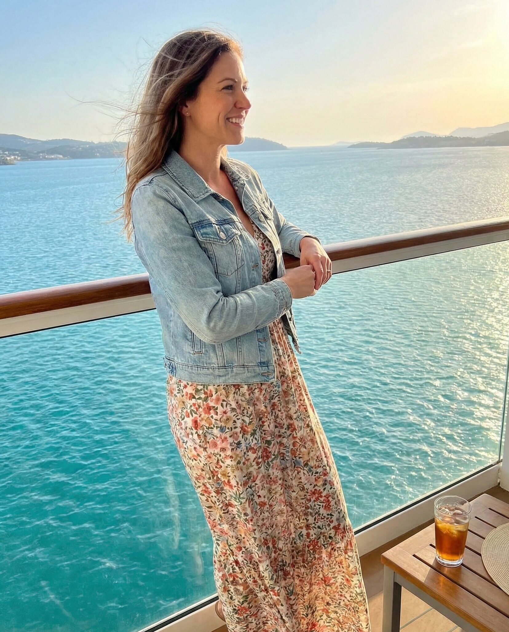 For early spring cruises in April, a lightweight trench coat layered over a casual dress provides warmth and sophistication. It’s practical for unpredictable coastal weather while keeping your style elevated and timeless throughout your Mediterranean journey.