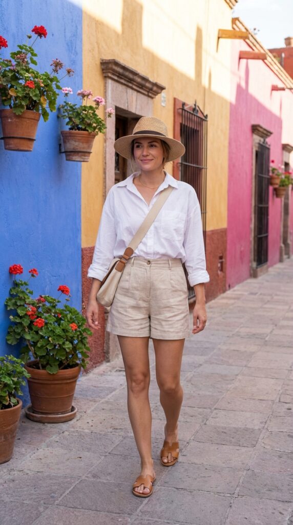 Lightweight linen shorts styled with a loose button-down shirt create an easy daytime look. Add slide sandals, a straw hat, and a crossbody bag for one of the most practical beach vacation outfits for women.