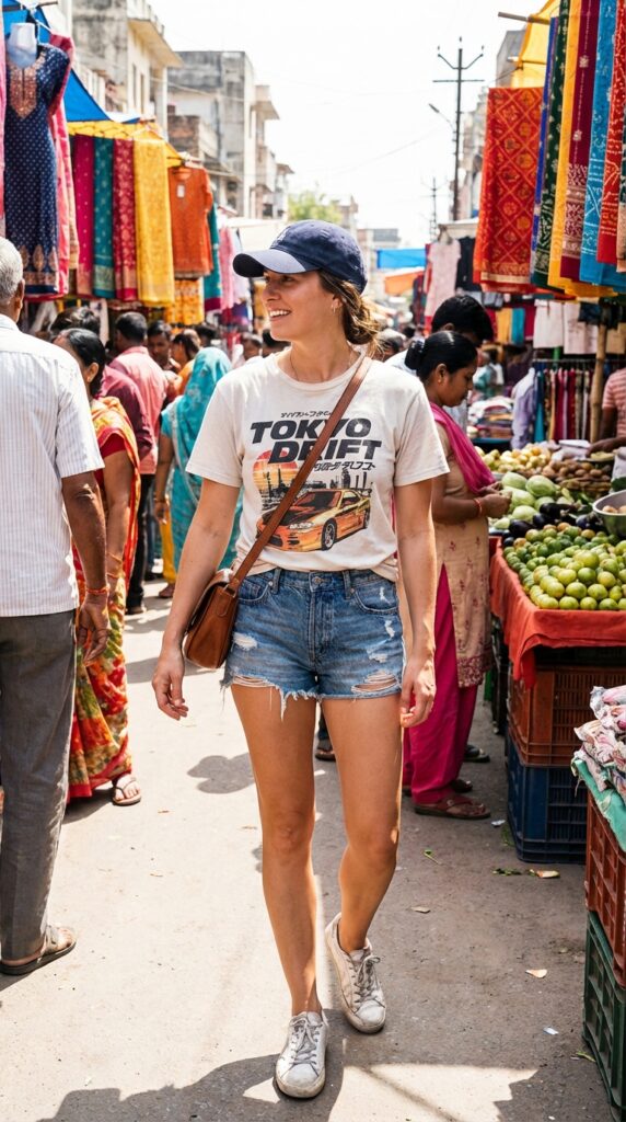 Keep it casual with classic denim shorts and a lightweight graphic tee. Add sneakers, a baseball cap, and a crossbody bag for a laid-back look perfect for sightseeing.