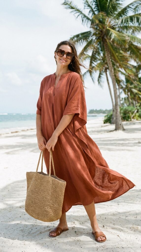 A flowy kaftan dress is perfect for beach days or lounging. Style it with simple slides, oversized sunglasses, and a woven tote for one of the easiest resort wear outfits for women.