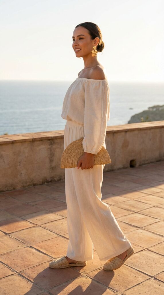 An off-shoulder blouse paired with flowy wide-leg pants feels instantly vacation-ready. Complete the look with espadrilles, statement earrings, and a clutch for a chic evening outfit perfect for coastal dinners.