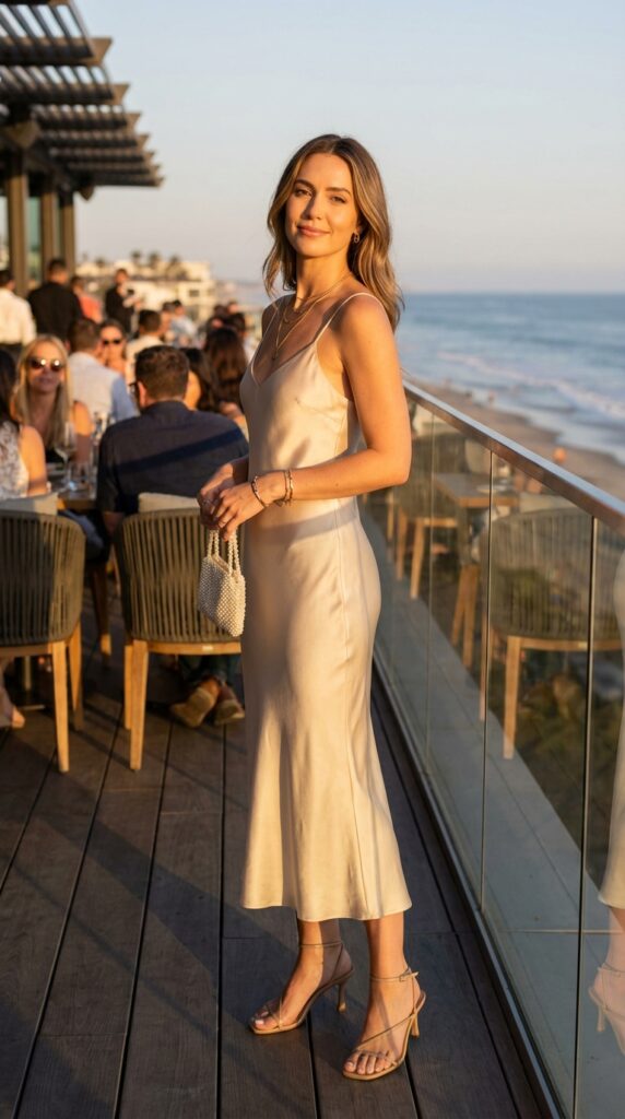 A satin or silk slip dress instantly elevates your evening style. Pair with heeled sandals, a clutch, and delicate jewelry for dinner-ready elegance with minimal effort.