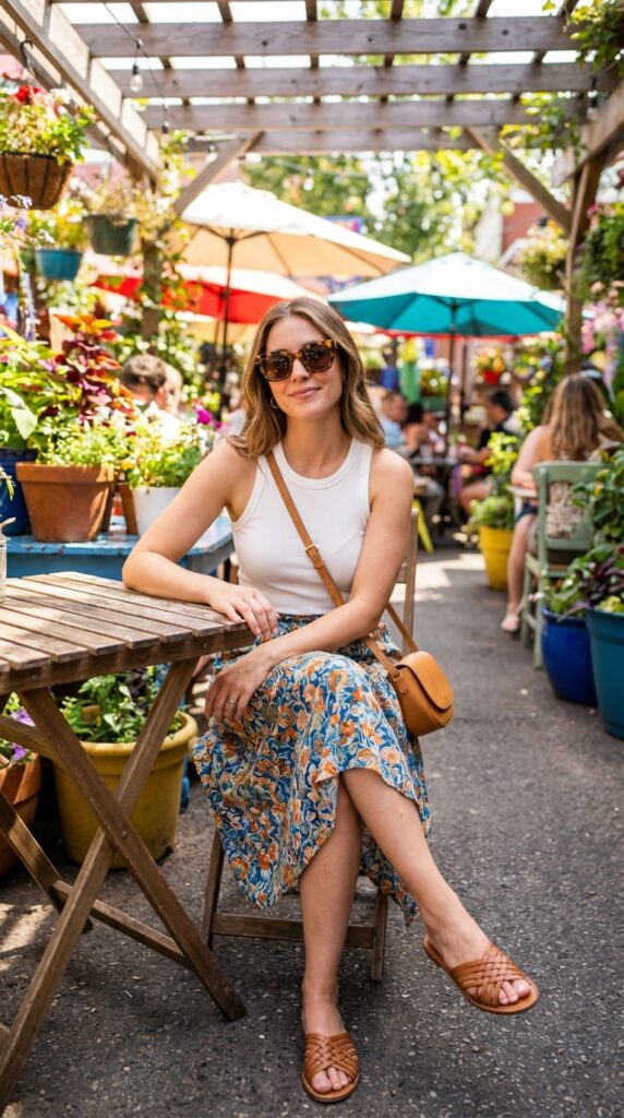 A fitted tank top tucked into a printed midi skirt creates a balanced silhouette. Add flat sandals, a crossbody bag, and statement sunglasses for an easy, breezy daytime look.