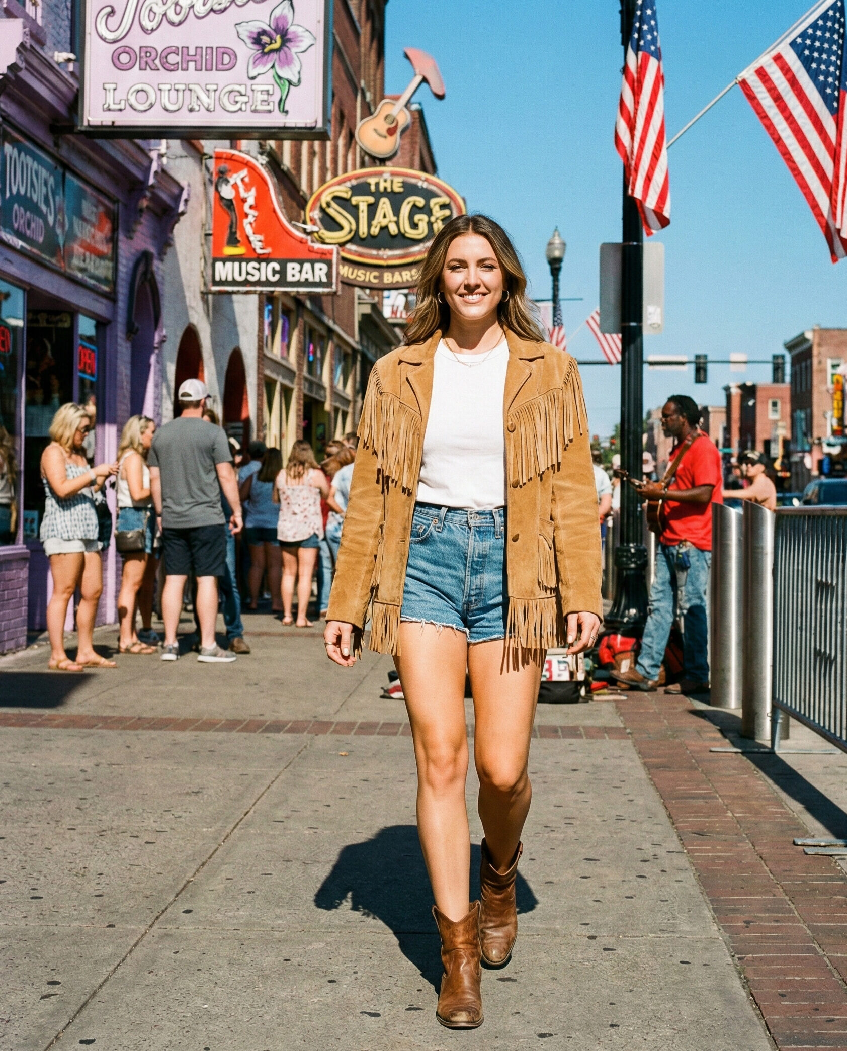 A fringe jacket instantly brings Nashville energy. Pair it with high-waisted denim shorts for a concert-ready look that feels playful and bold. Add a simple tee or tank underneath and ankle boots to keep the outfit balanced, stylish, and perfect for dancing all night.