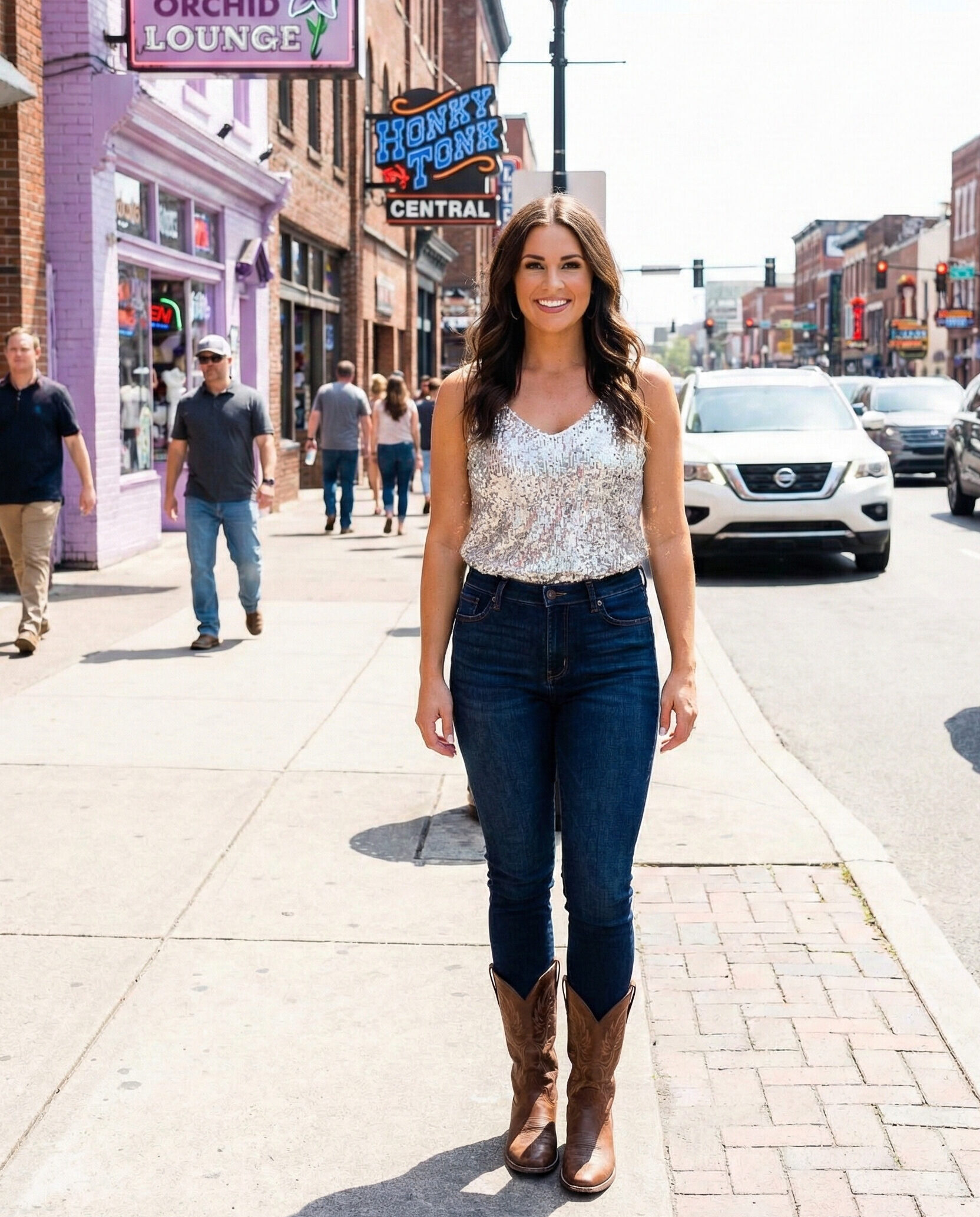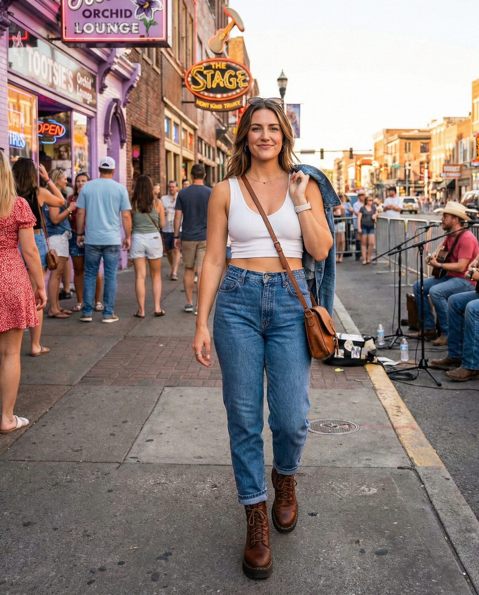 A flowy mini dress keeps things feminine and fun, while cowboy boots ground the look in Nashville style. This outfit works beautifully for concerts and casual bars. Add a crossbody bag and let the dress move freely as you walk.