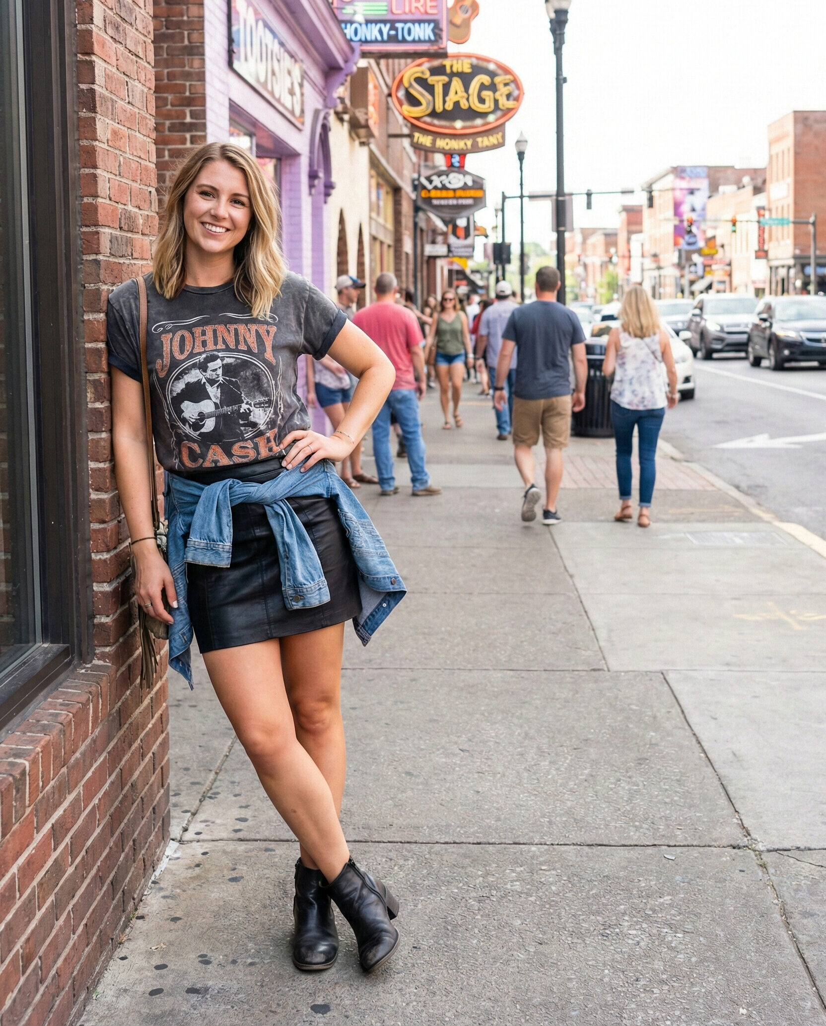 A denim skirt paired with a fitted tank is simple yet stylish. It’s perfect for warm evenings and casual bars. Add western boots or sneakers and minimal accessories for an easy, Nashville-inspired look that feels relaxed and fun.