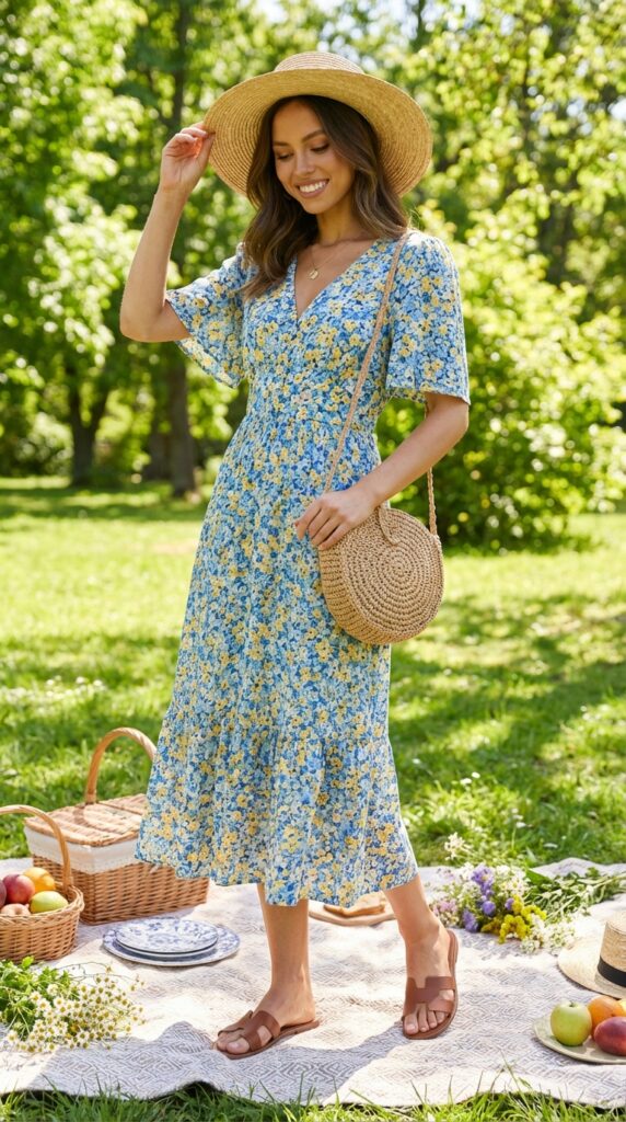 A flowy floral midi dress instantly sets the picnic mood. Pair it with flat sandals, a woven straw hat, and a crossbody bag for an easygoing yet polished look. This outfit channels soft Spring Fits energy while staying perfectly aligned with Ny Summer Outfits trends.
