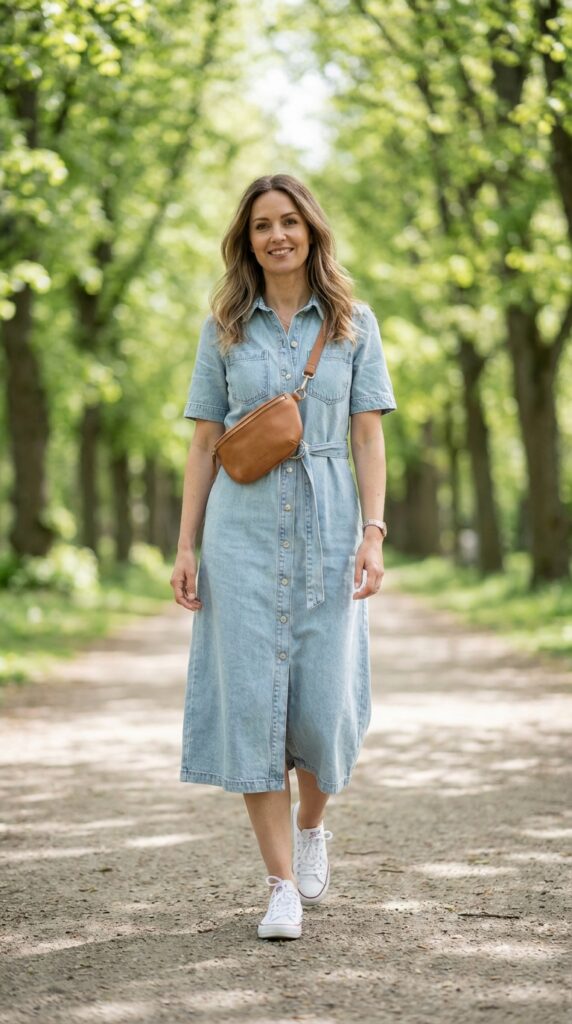9. Denim Dress with White Sneakers