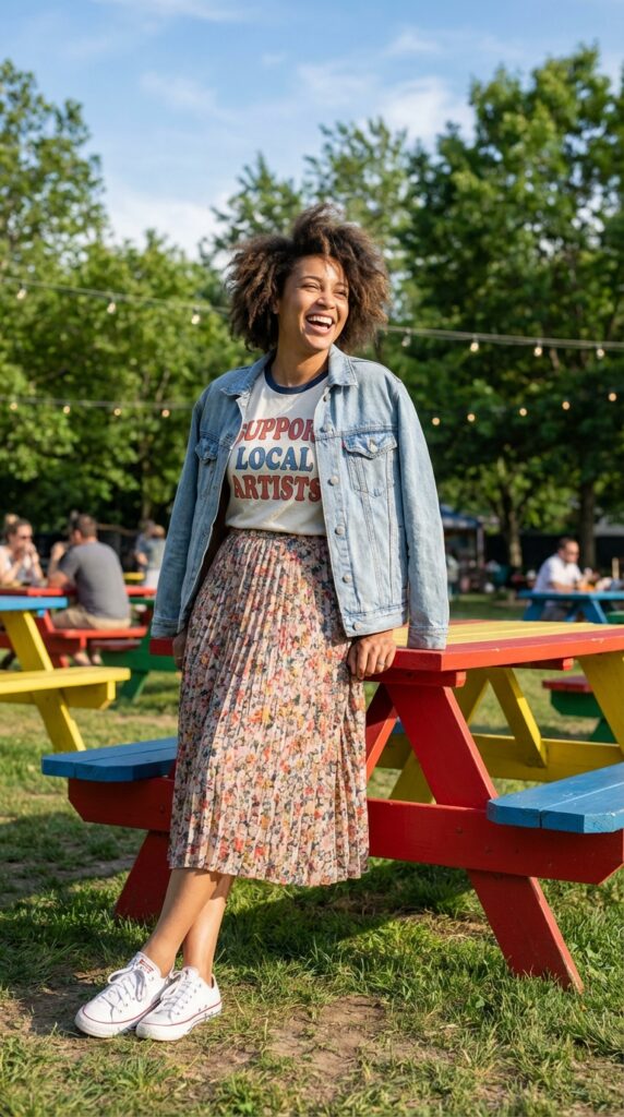 Mix casual and chic by pairing a graphic tee with a pleated skirt. Add sneakers and a denim jacket for layering. This outfit reflects playful Spring Fits while staying practical for a breezy picnic afternoon.