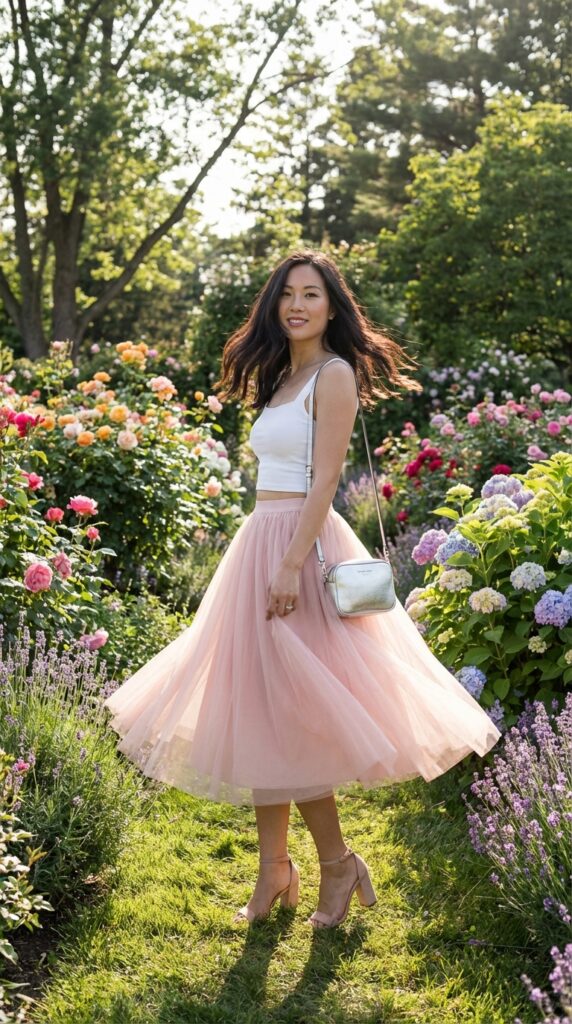 A pastel pink tulle skirt combined with a fitted crop top creates a playful, girly vibe. Finish with block heels and a metallic mini bag, ideal for Bach Outfit Themes and group photo moments.