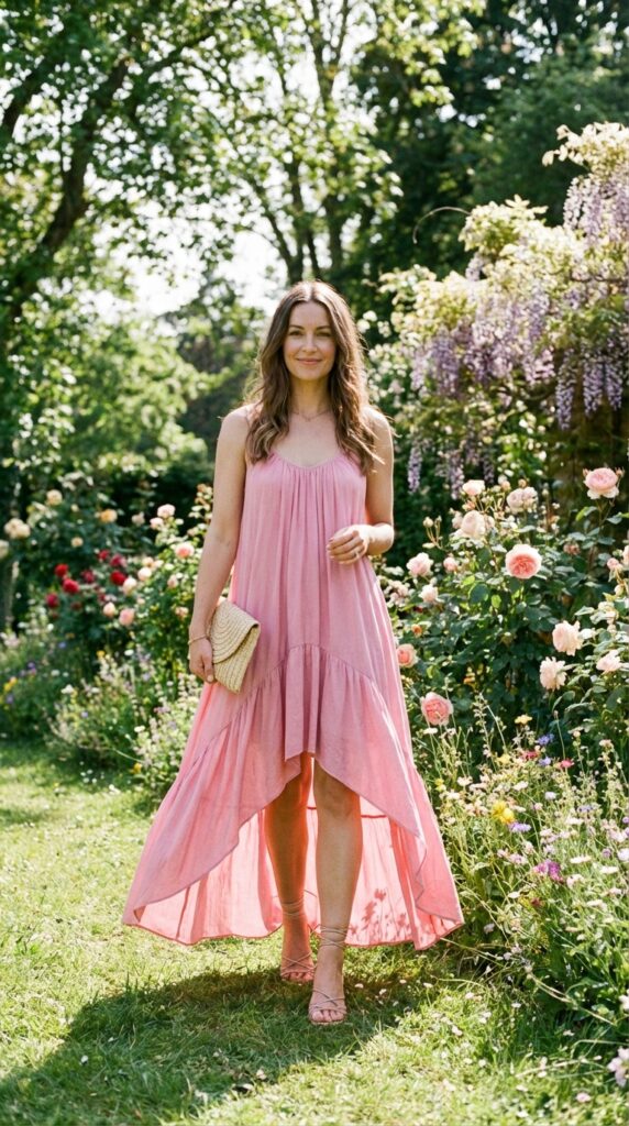 A flowing pink high-low maxi dress paired with strappy sandals and a statement clutch. Elegant yet fun, ideal for outdoor Pink Nashville Outfit inspiration and daytime events.