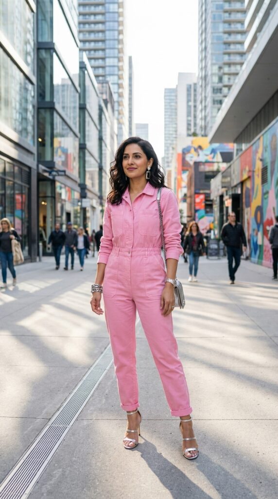 A tailored jumpsuit in bubblegum pink with strappy heels and metallic accessories. Perfect for modern Colorful Bachelorette Party Outfits that balance chic and playful vibes.