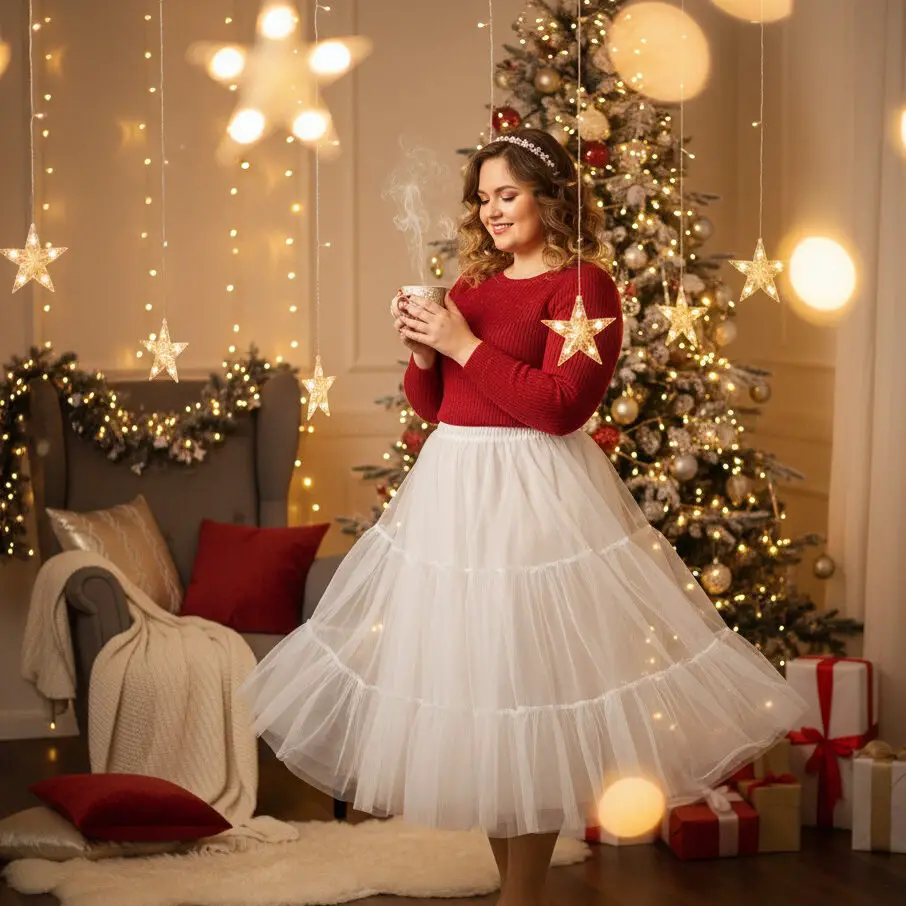 A layered tulle skirt brings whimsical holiday vibes. Pair it with a fitted knit top for a balanced, flattering look that feels magical and festive.