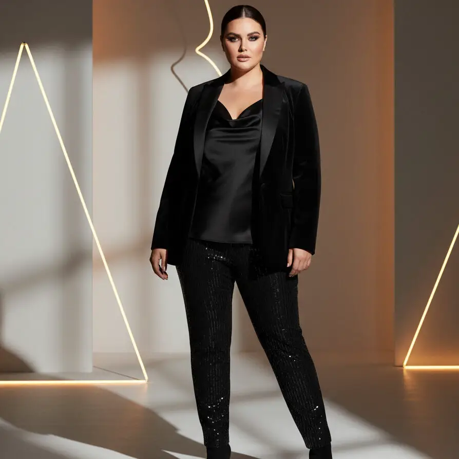 A classic black monochrome outfit is slimming, timeless, and always stylish. Mix textures like velvet, satin, or sequins to elevate the look.