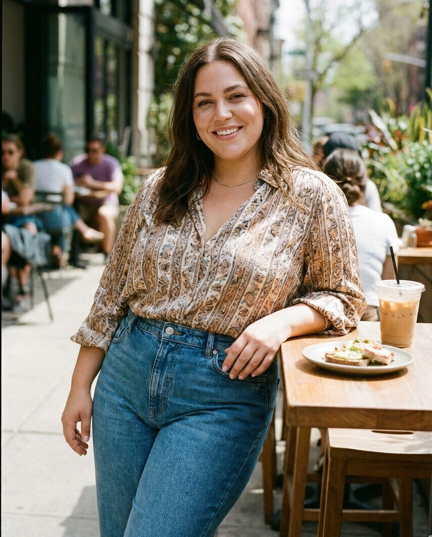 A flowy blouse tucked into high-waisted jeans creates a balanced silhouette that highlights the waist without clinging. This outfit feels relaxed yet intentional, making it perfect for casual dinners or low-key date nights where comfort matters.