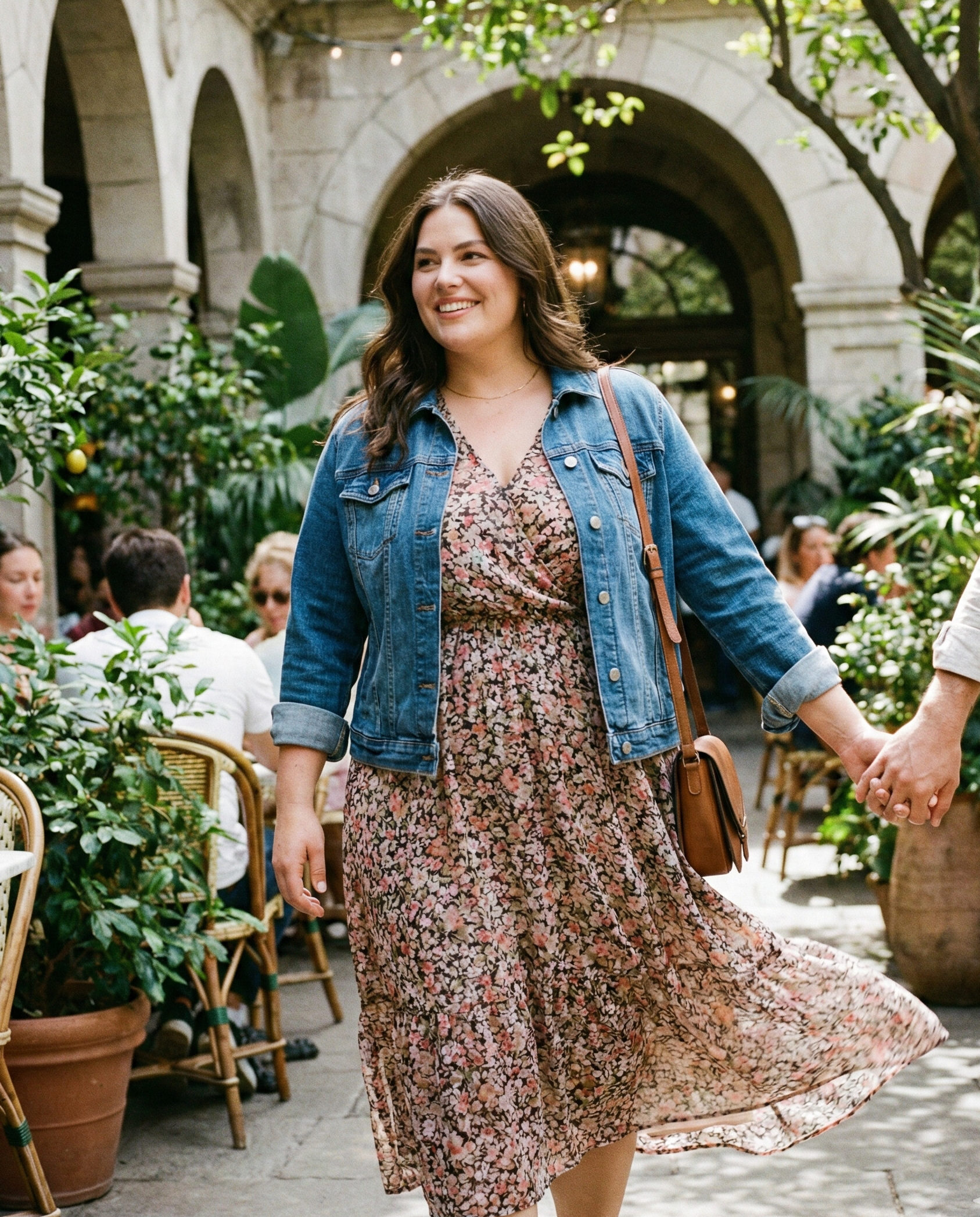 A midi dress offers elegant coverage while still feeling romantic and stylish. Adding a denim jacket gives structure and a casual edge, making this outfit ideal for laid-back dinners or evenings that call for both comfort and polish.