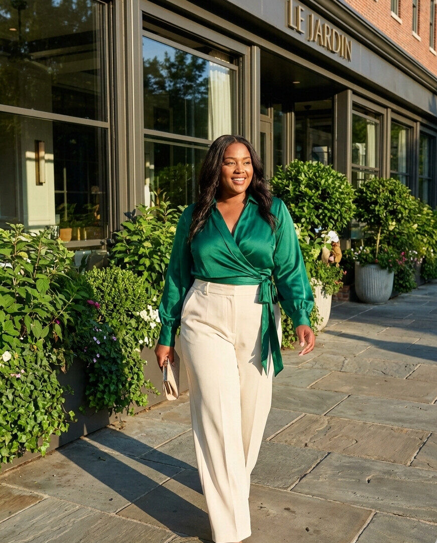 A wrap top naturally enhances the waist, while wide-leg trousers create a long, elegant line. This combination feels confident and stylish without trying too hard, making it a great choice for upscale restaurants or evening outings.