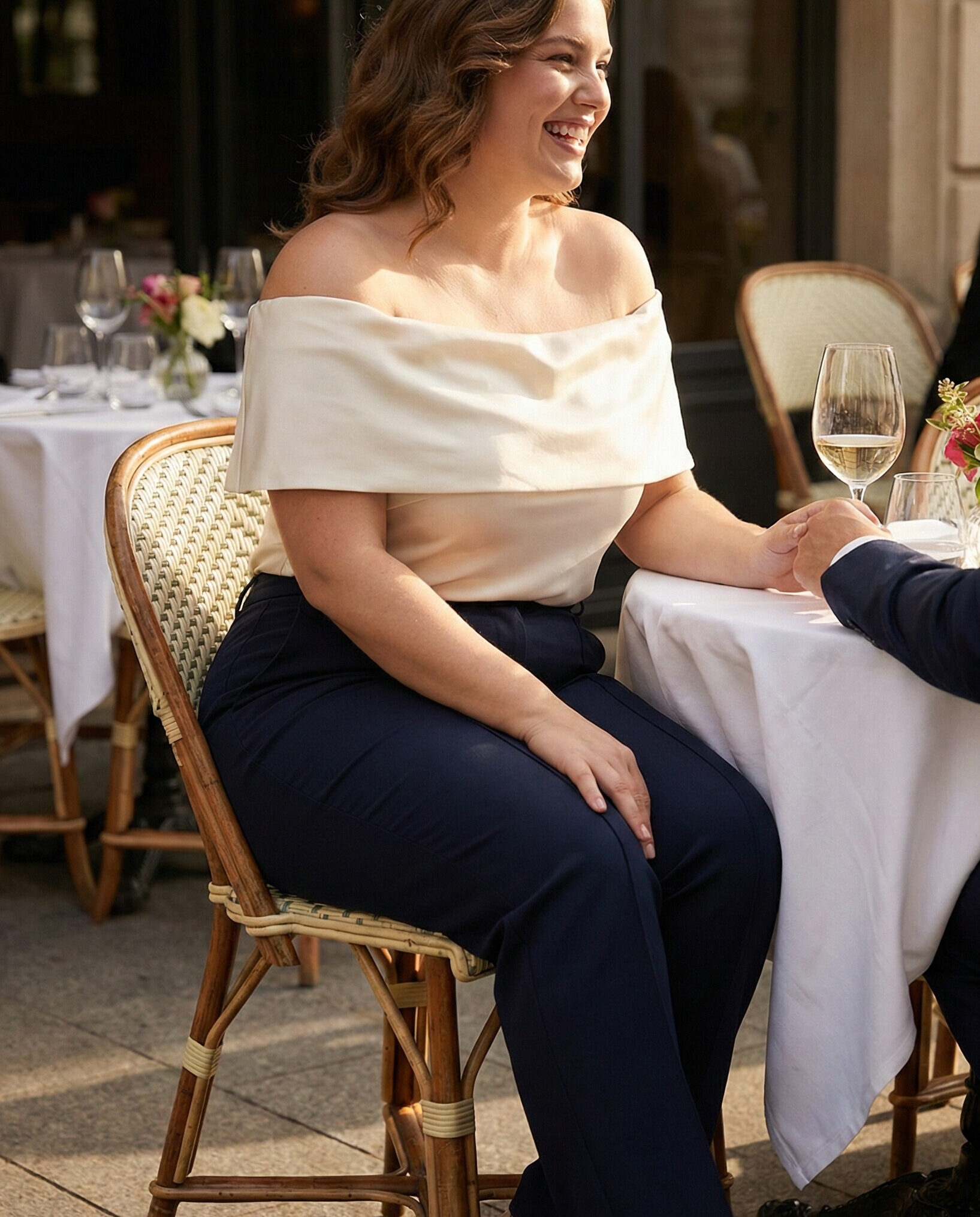 An off-shoulder top softly highlights the neckline and shoulders, adding a subtle romantic touch. Paired with straight-leg pants, this outfit creates a balanced and flattering silhouette that works beautifully for dinner dates.
