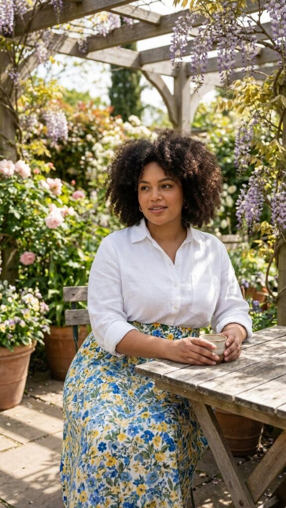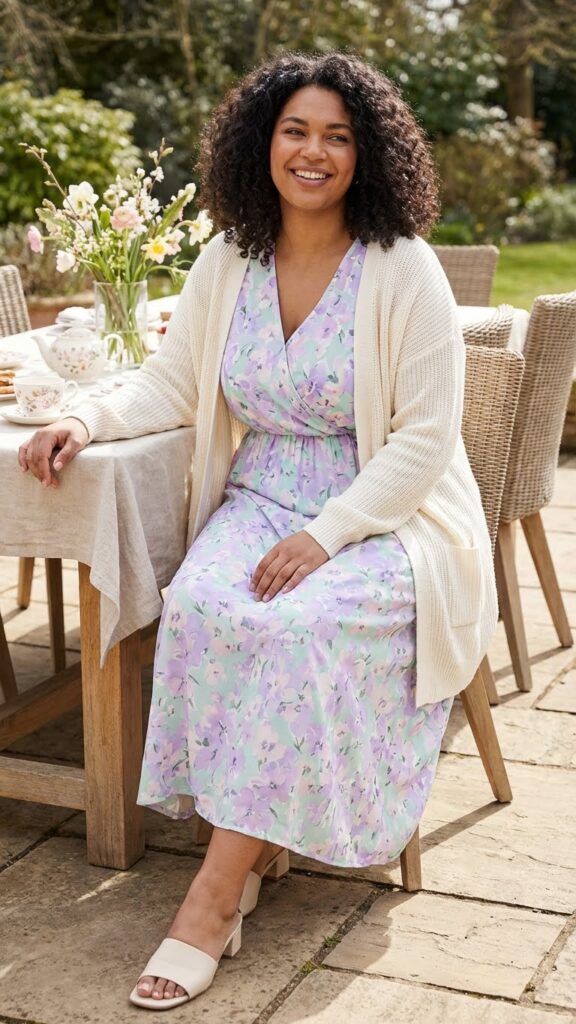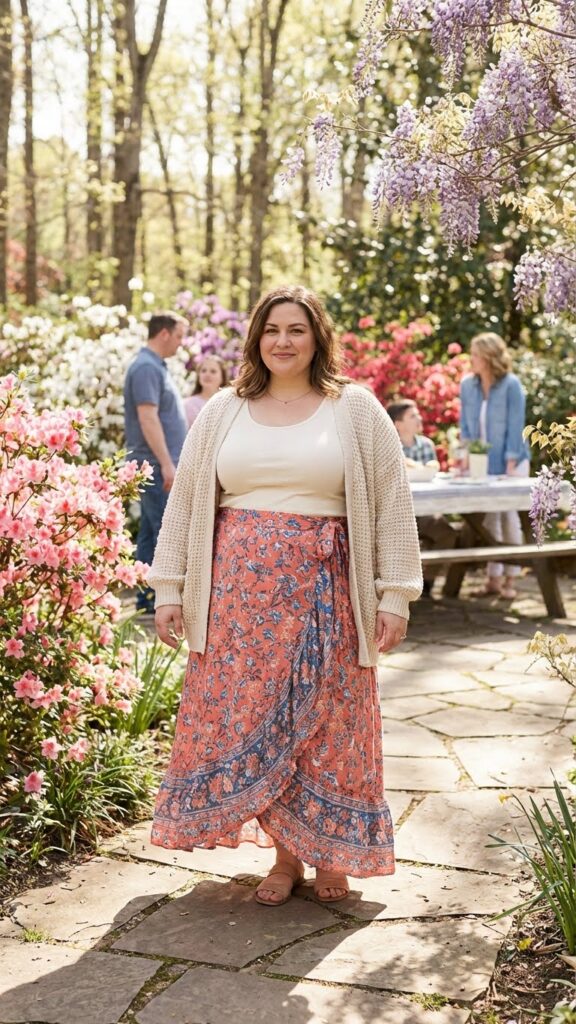 A maxi wrap skirt allows movement and adjustable comfort, making it ideal for plus-size women. Pair it with a simple tank and a lightweight cardigan for an easy, polished Easter look. This layered outfit also works well for unpredictable spring weather.