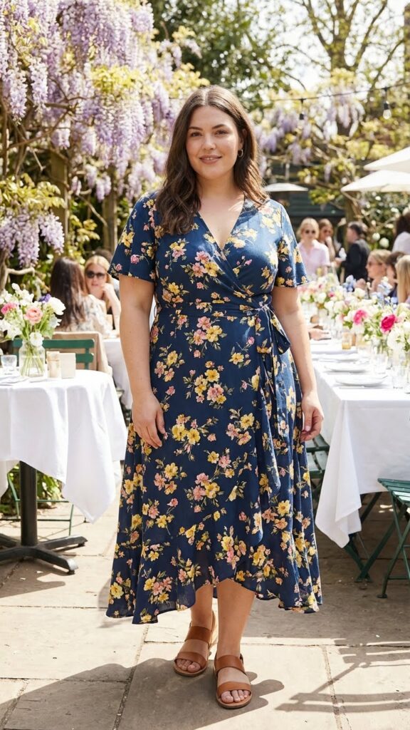 A floral wrap dress flatters curves effortlessly by defining the waist and offering adjustable comfort. The flowy skirt creates movement while the floral print adds spring charm. Paired with comfortable sandals, this outfit is perfect for church, brunch, or outdoor events where you want to look polished without sacrificing ease.