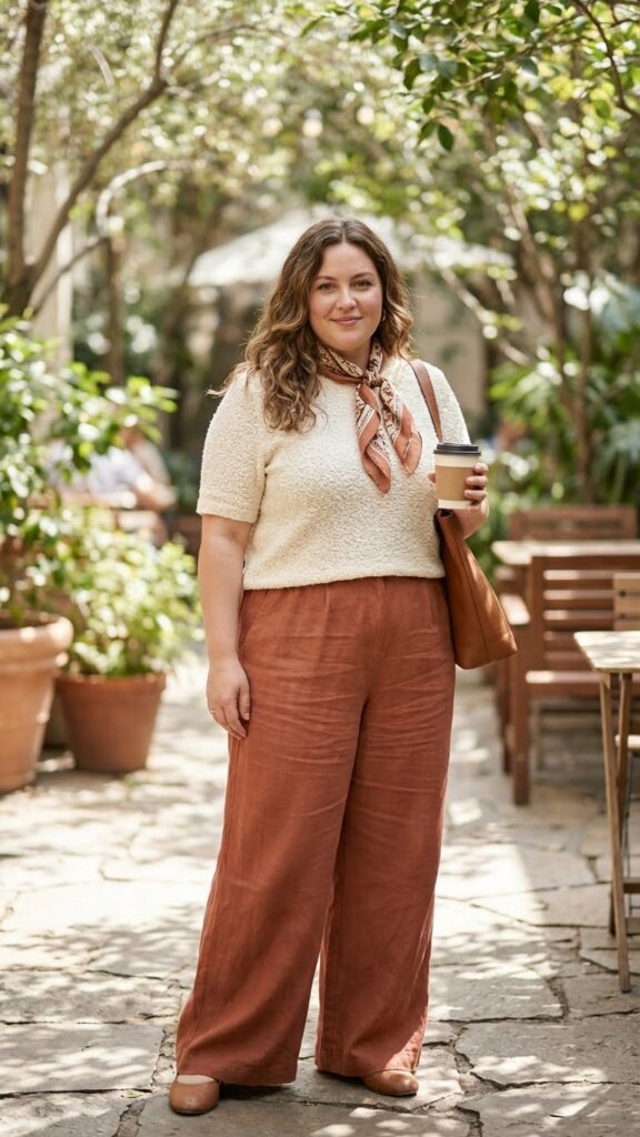 A soft knit top paired with wide-leg pants creates a balanced, comfortable silhouette that feels elegant yet relaxed. Wide-leg trousers offer great movement and flatter the hips effortlessly. This outfit is perfect for women who want polished comfort without wearing a dress.