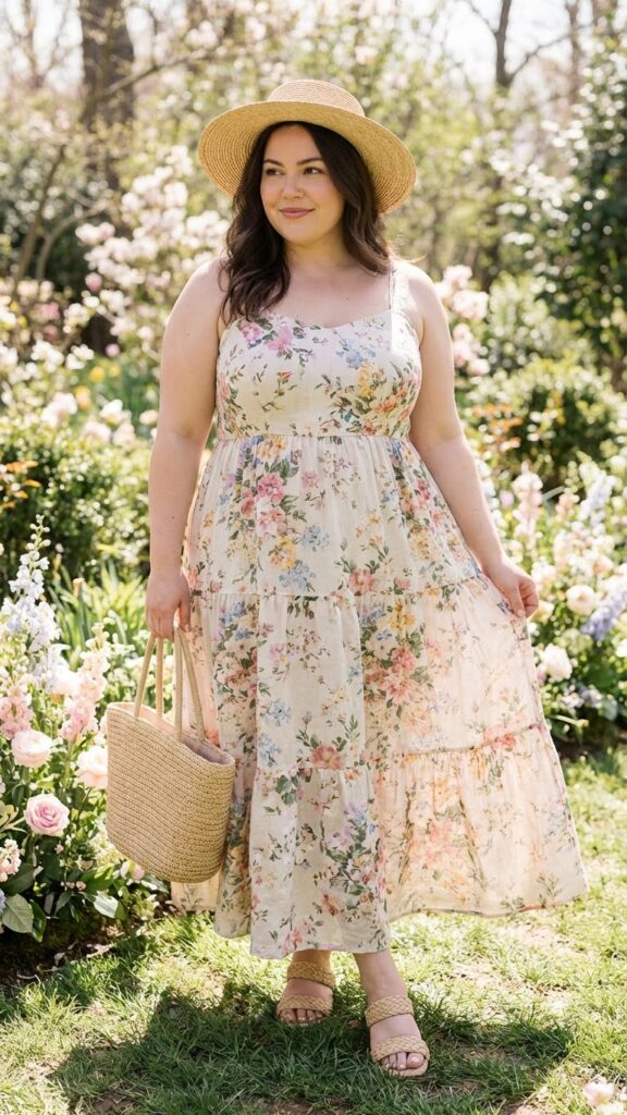 A tiered maxi dress creates beautiful shape and flow, making it a perfect plus-size Easter look. The tiers add dimension without clinging to the body, while woven accessories—like a straw bag or sandals—enhance the spring vibe. Great for outdoor brunches or garden gatherings.