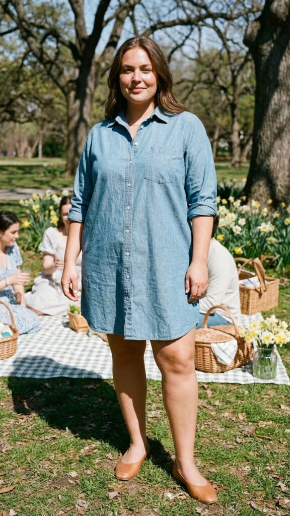A chambray shirt dress is both breathable and flattering thanks to its structured yet relaxed fit. It’s an excellent choice for warm spring weather and easily styled with tan flats or sandals. Comfortable, cute, and ready for all-day Easter fun.