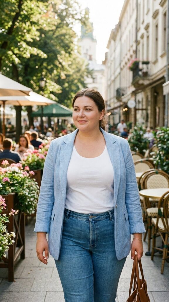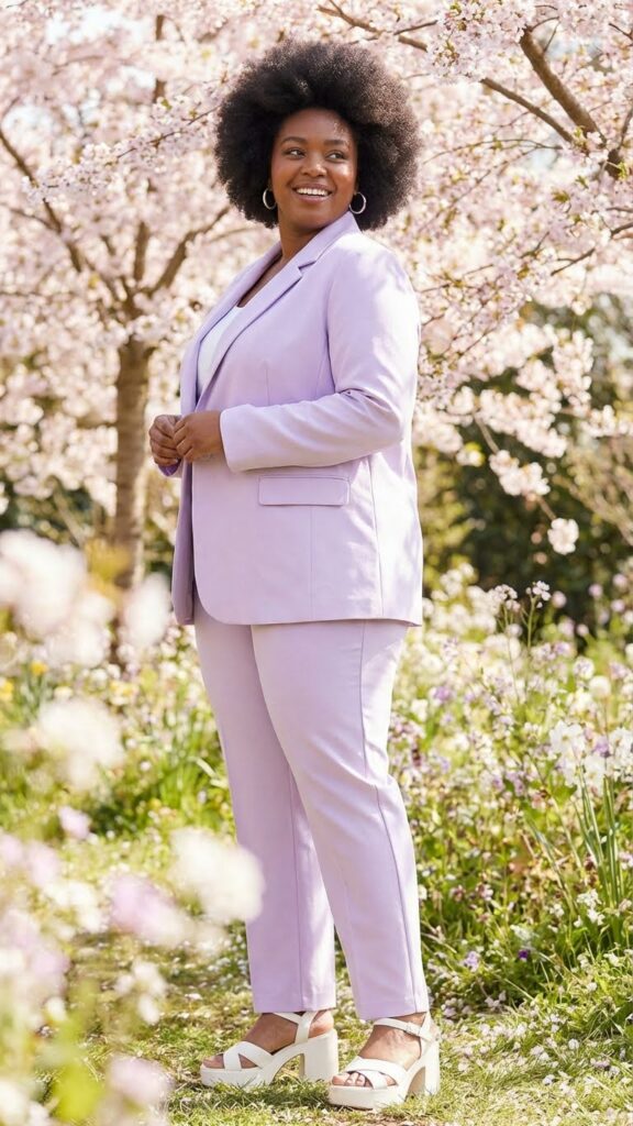 A pastel blazer instantly elevates a basic tee-and-jeans combination. This layered look creates structure through the shoulders and adds soft spring color. Perfect for plus-size women who want a polished outfit that’s still comfortable and casual enough for a family-filled Easter day.