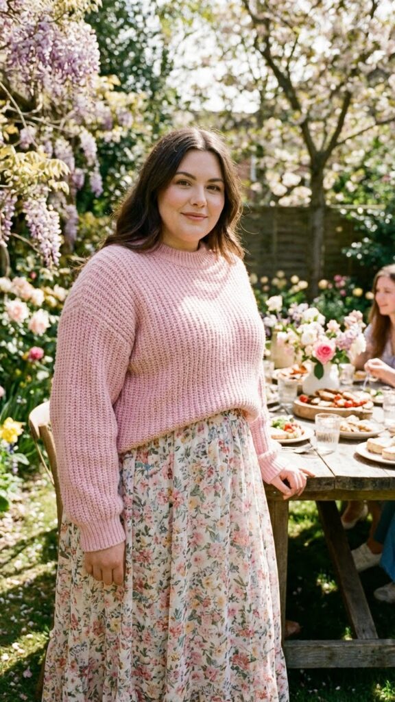 Pairing a soft pink sweater with a floral skirt creates a sweet, flattering Easter outfit. The sweater adds warmth without bulk, while the skirt brings movement and pattern. This is a great choice for women who prefer a modest, cozy look that still feels festive and stylish.