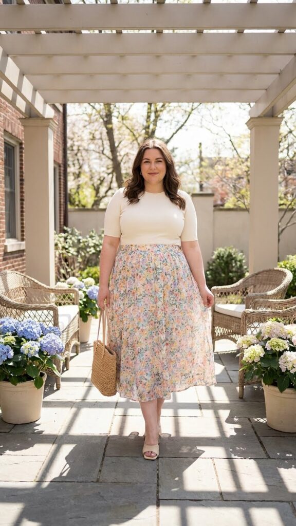 An A-line skirt is one of the most flattering silhouettes for plus-size figures because it highlights the waist while skimming gracefully over the hips. Pair it with a fitted top to create balance. This outfit works well for church, brunch, or family photos.