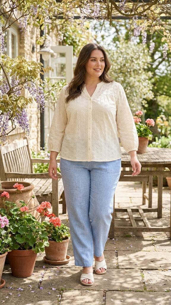 A white eyelet blouse brings soft texture and feminine charm, while pastel pants keep the outfit fresh and spring-themed. This combination is chic, lightweight, and perfect for more relaxed Easter gatherings. Add simple accessories to complete the polished look.