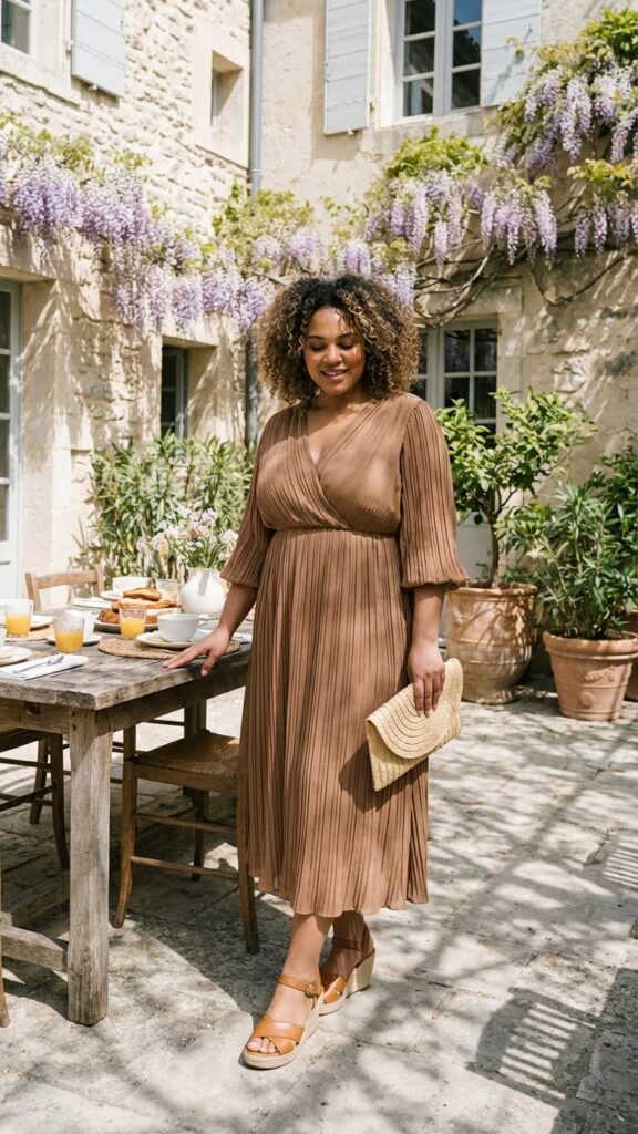 A pleated midi dress offers shape, elegance, and great movement. The pleats add dimension without adding bulk, while the midi length elongates the silhouette. Paired with neutral wedges, this outfit is perfect for brunch or outdoor photos.