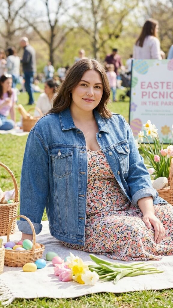 A denim jacket layered over a printed sundress creates an easy, approachable Easter look. The jacket adds structure and a bit of warmth, while the sundress keeps things breezy and feminine. This outfit is perfect for moms, brunch plans, or outdoor celebrations.