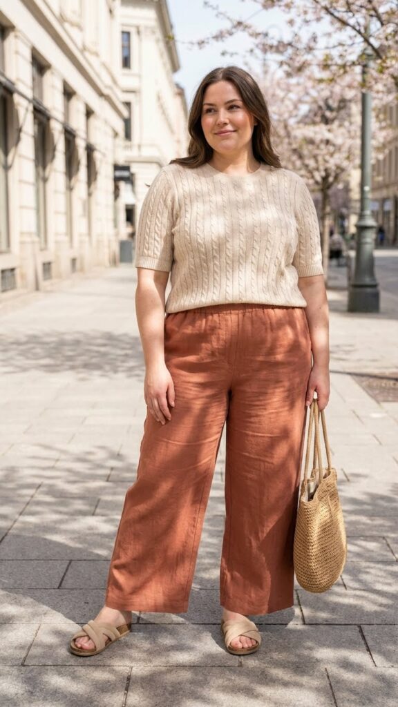 Wide-leg pants create a flattering silhouette for plus-size bodies by balancing the hips and allowing easy movement. Pair them with a soft knit top that gently skims the body for a polished yet relaxed spring look. This outfit works great for everyday errands, casual work settings, or lunch plans.
