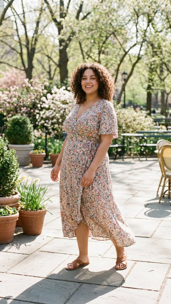 A wrap dress is one of the most flattering options for plus-size women because it defines the waist naturally while allowing flexibility and comfort. Choose spring prints or pastel colors and pair with comfortable sandals for a chic, easy outfit that works from daytime to early evening.