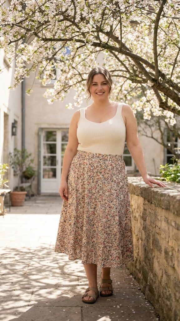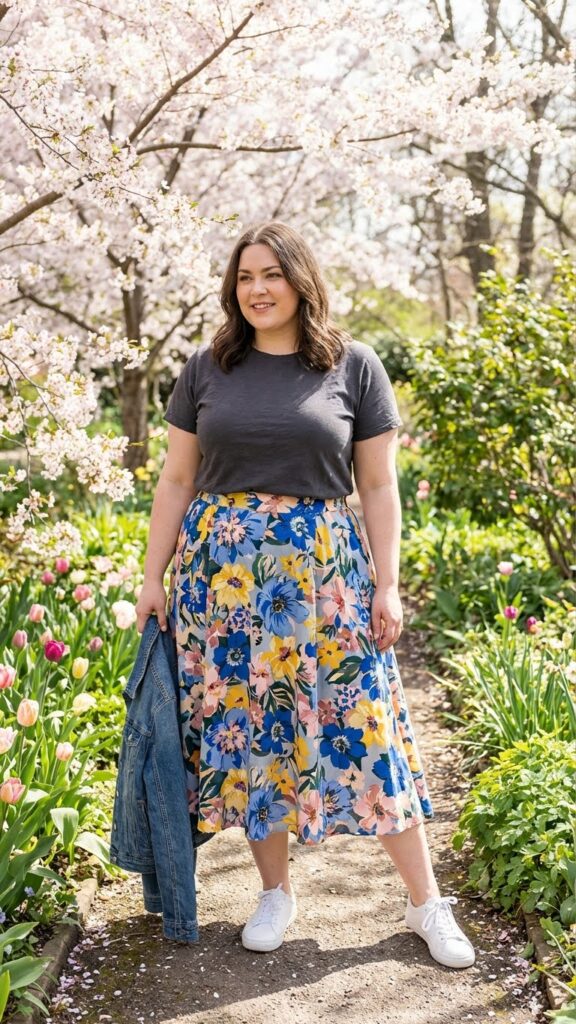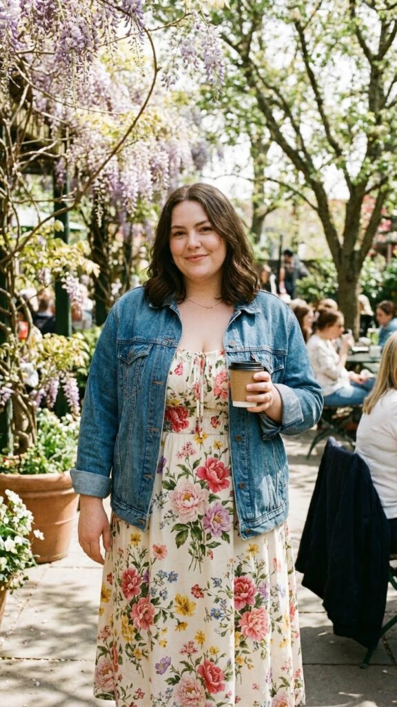 A floral midi dress is a spring staple that flatters curves beautifully by offering flow and movement without clinging. Adding a denim jacket creates structure and balance while keeping the look casual and practical for changing spring weather. This outfit is perfect for brunch dates, casual outings, or weekend events where comfort and femininity matter.