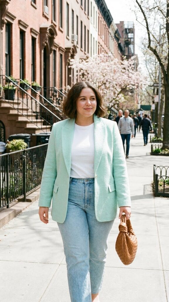 A pastel blazer instantly elevates a casual outfit while keeping it spring-appropriate. Layer it over a simple tee and straight-leg jeans for a structured yet comfortable look. This outfit works well for casual office days, brunch, or meetings where you want to feel confident and stylish.