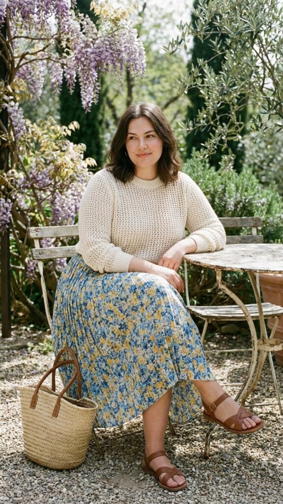 A lightweight sweater paired with a midi skirt creates a chic spring outfit that’s comfortable and flattering. The midi length offers coverage and elegance, while the sweater adds softness. This look works beautifully for cooler spring mornings or casual gatherings.