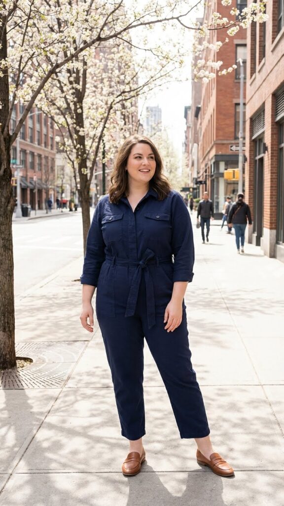 A belted jumpsuit defines the waist while offering all-day comfort. Choose breathable fabrics and spring-friendly colors to keep the look fresh. Flats complete the outfit, making it practical for walking, shopping, or social plans.