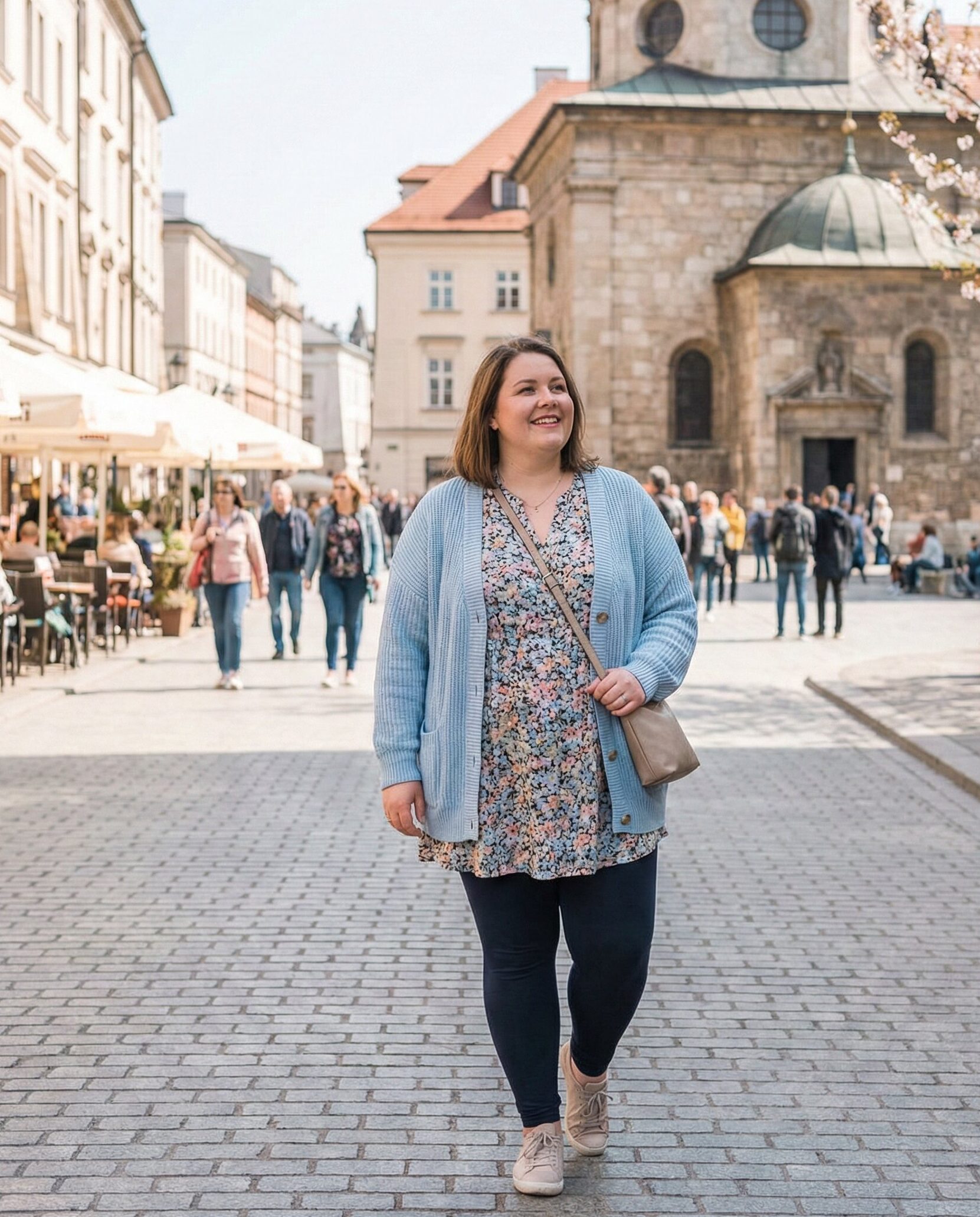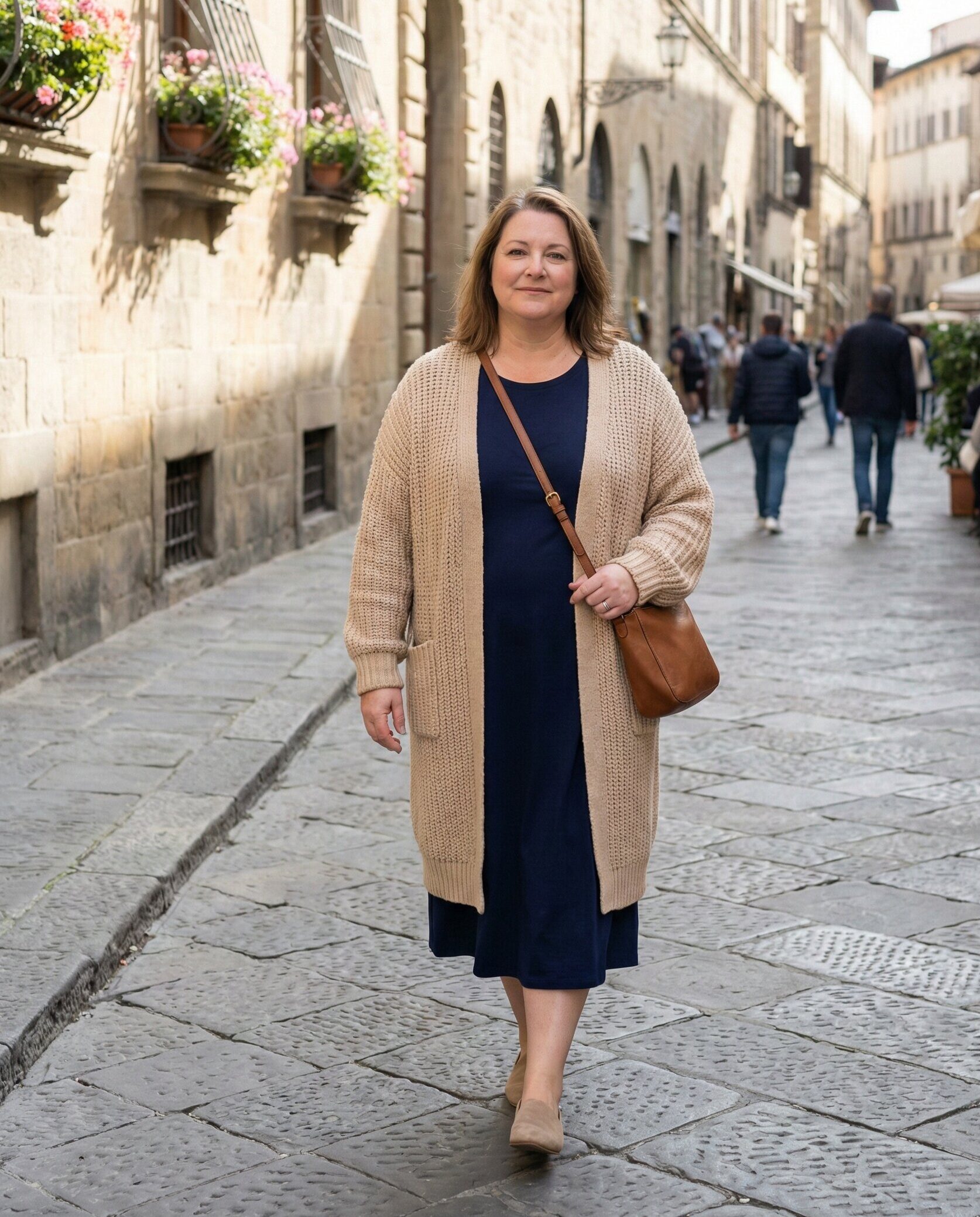 A lightweight cardigan layered over a flowy tunic creates a comfortable yet stylish look. Paired with supportive leggings, this outfit is ideal for travel days, sightseeing, and relaxed exploring while maintaining a neat and flattering silhouette.