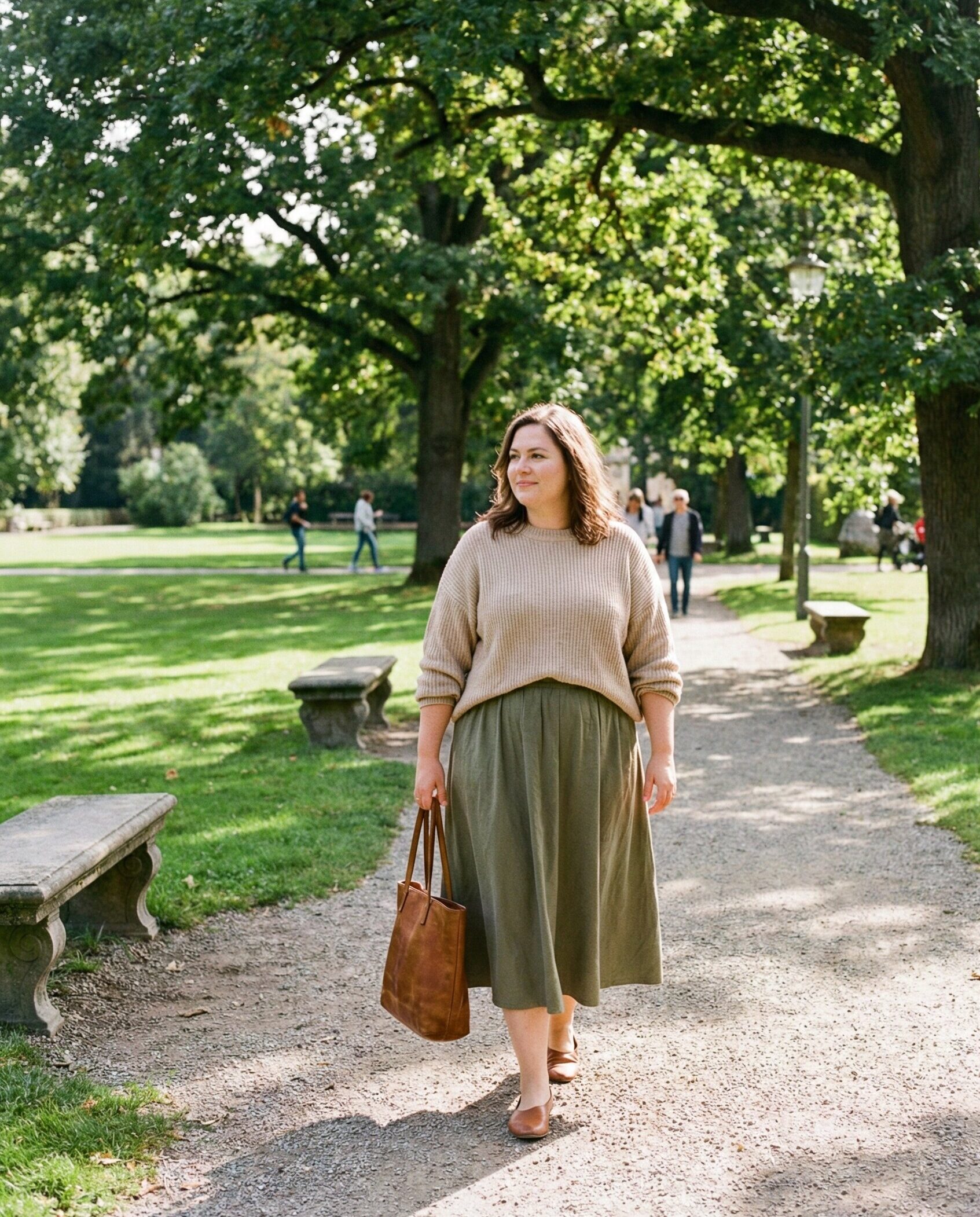 A neutral sweater paired with a midi skirt creates a balanced and elegant silhouette. The soft layers work well for cooler mornings, while the skirt adds movement and femininity for relaxed European spring days.