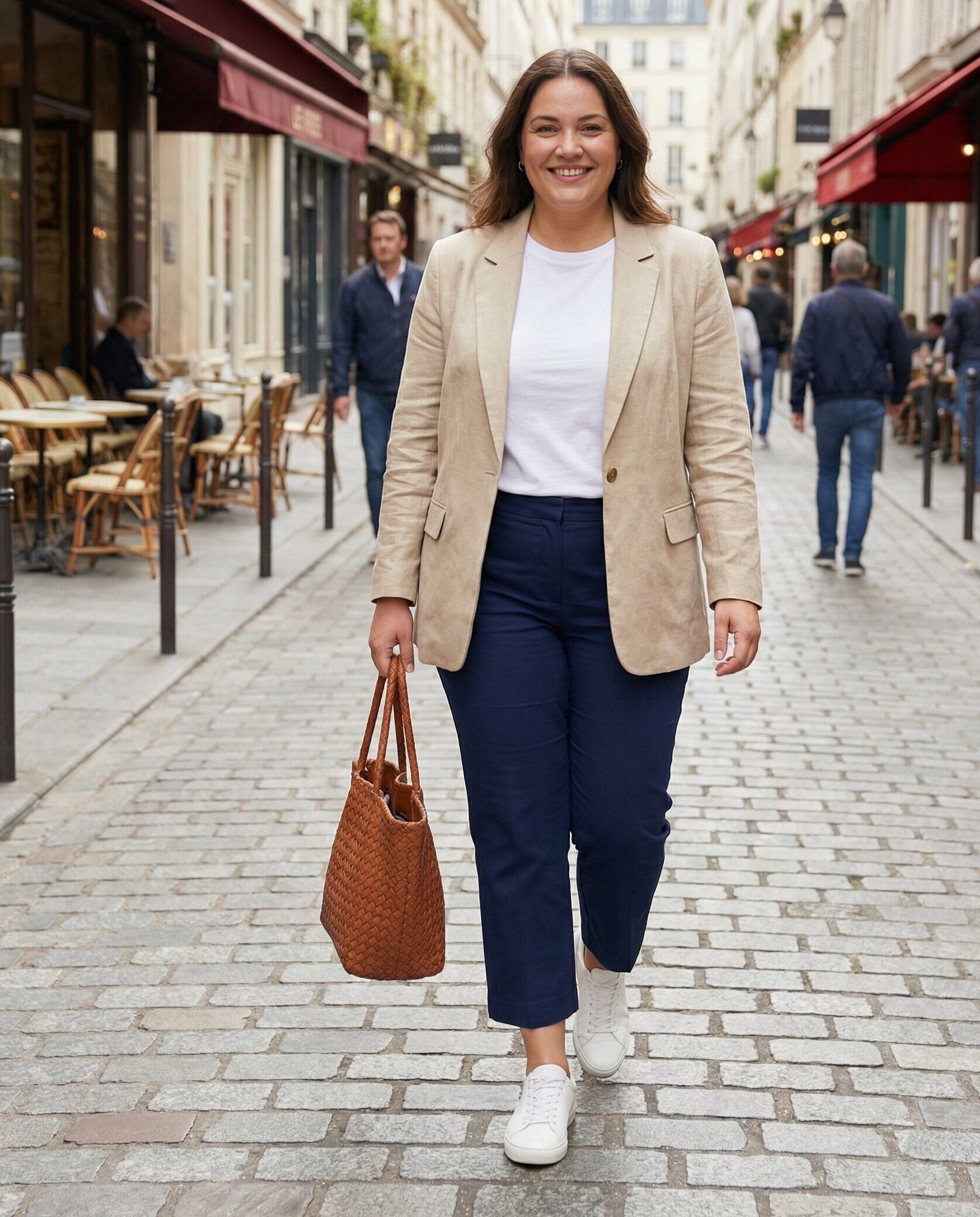 A linen blazer adds instant sophistication while staying breathable. Worn over a basic tee with straight-leg pants, this outfit balances comfort and elegance, making it perfect for museums, shopping streets, and casual dining.