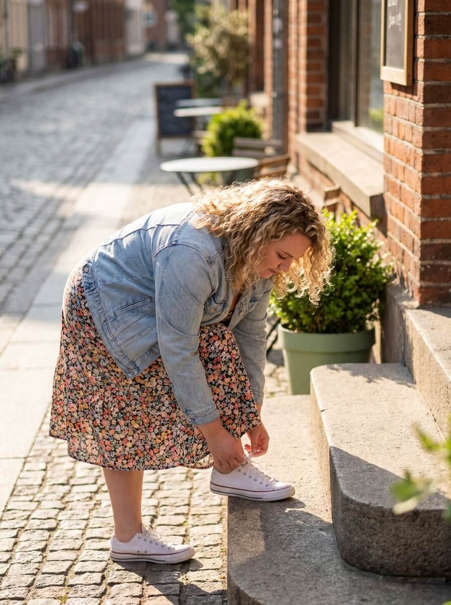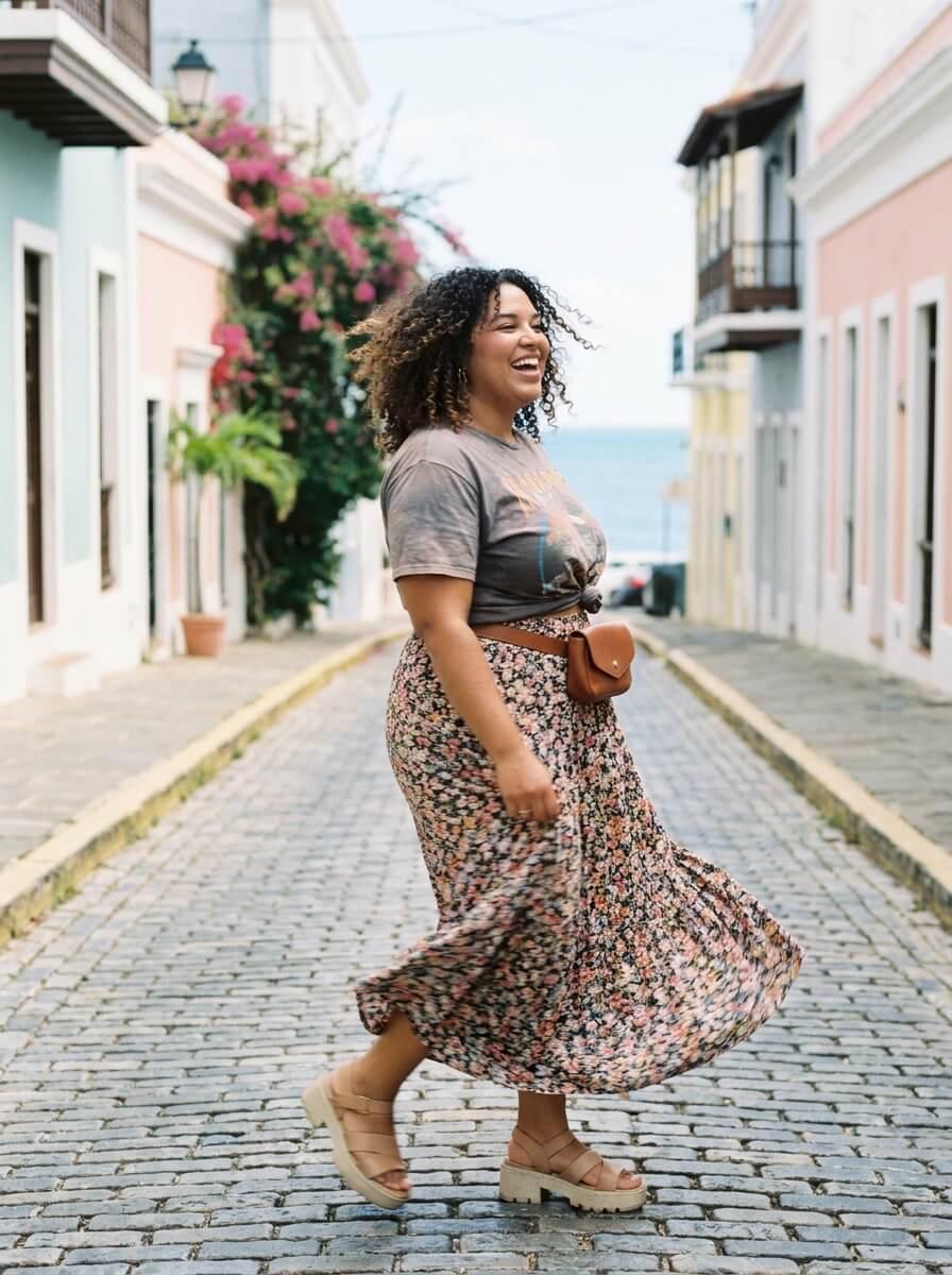 A relaxed graphic tee tucked into a flowy maxi skirt creates a playful, modern vibe. Add platform sandals and a belt bag for a trendy plus size summer outfit that feels youthful without trying too hard.